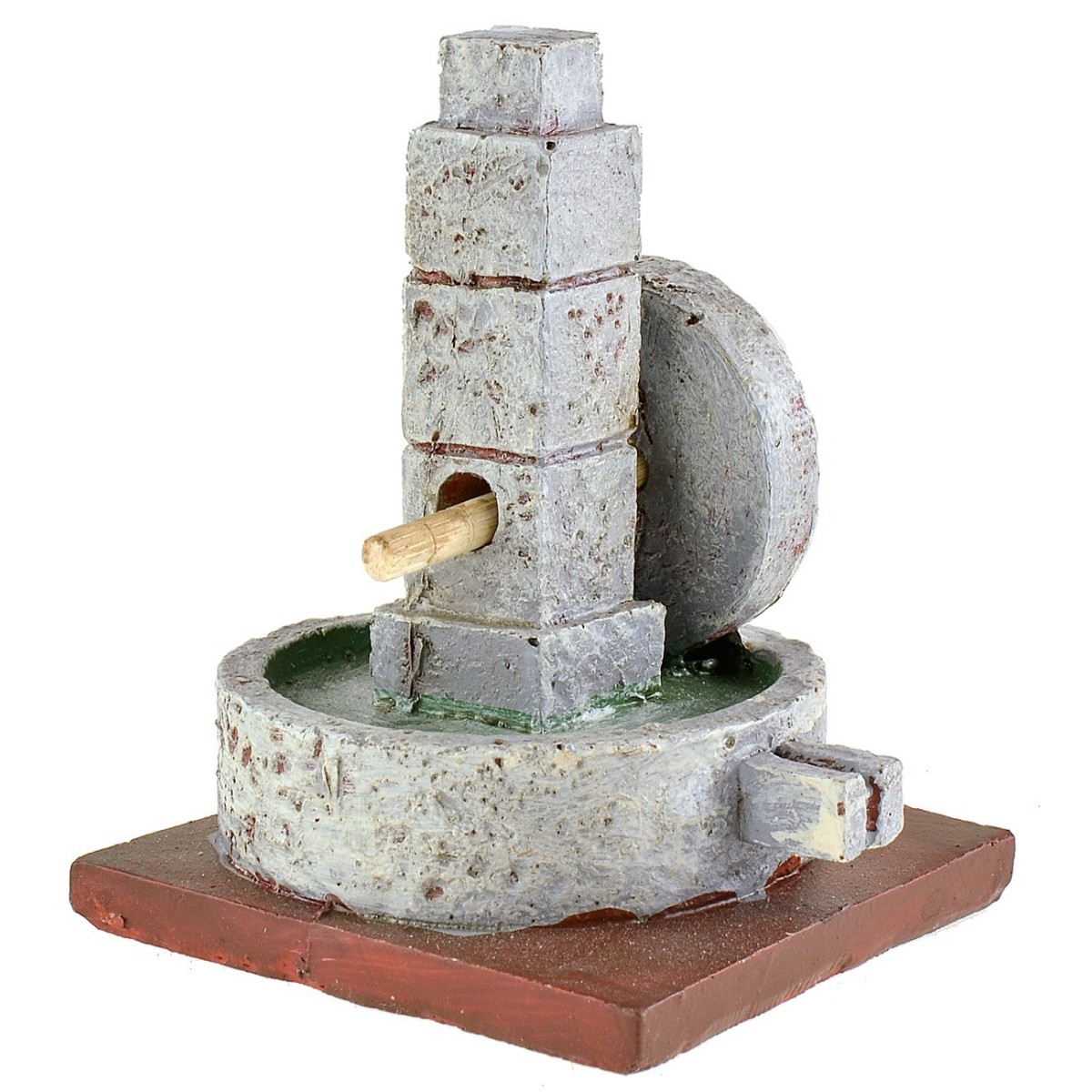 Macina in resina su base quadrata con corpo inferiore circolare su cui è installata al centro una struttura verticale che girando con la ruota permette di spremere le olive e di far uscire l'olio dal rubinetto laterale. L'accessorio per presepe è consigliato per statuine di altezza 6-6,5 cm. e si precisa che il prodotto è venduto senza la statuina in quanto l'immagine è solo dimostrativa. Le statuette le trovate nei prodotti correlati scorrendo sotto la tabella delle misure.