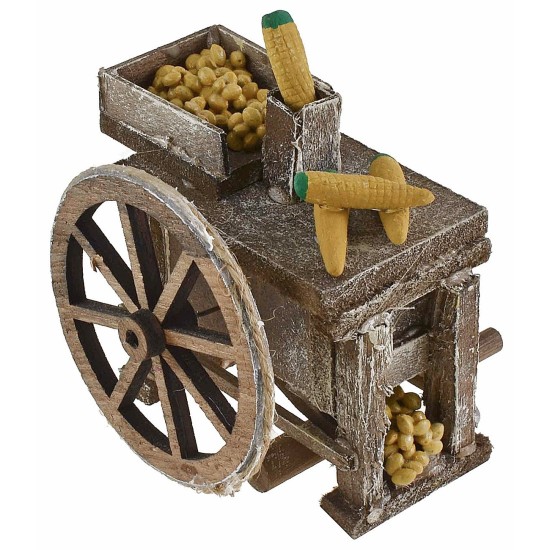 Macina per granoturco realizzata in legno da artigiani italiani, sul piano sono presenti delle pannochie e mais e sul lato è presente la ruota che si potrà far girare manulmente tramite una manovella presente sulla destra. L'attrezzo è ideale per arricchiere ambienti di campagna nel presepe. L'articolo è consigliato per statue altezza 10-12 cm e si precisa che essendo prodotto a mano potrebbe leggermente variare rispetto alla foto. Nella sezione MINUTERIE sono disponibili tanti accessori per presepe da abbinare.