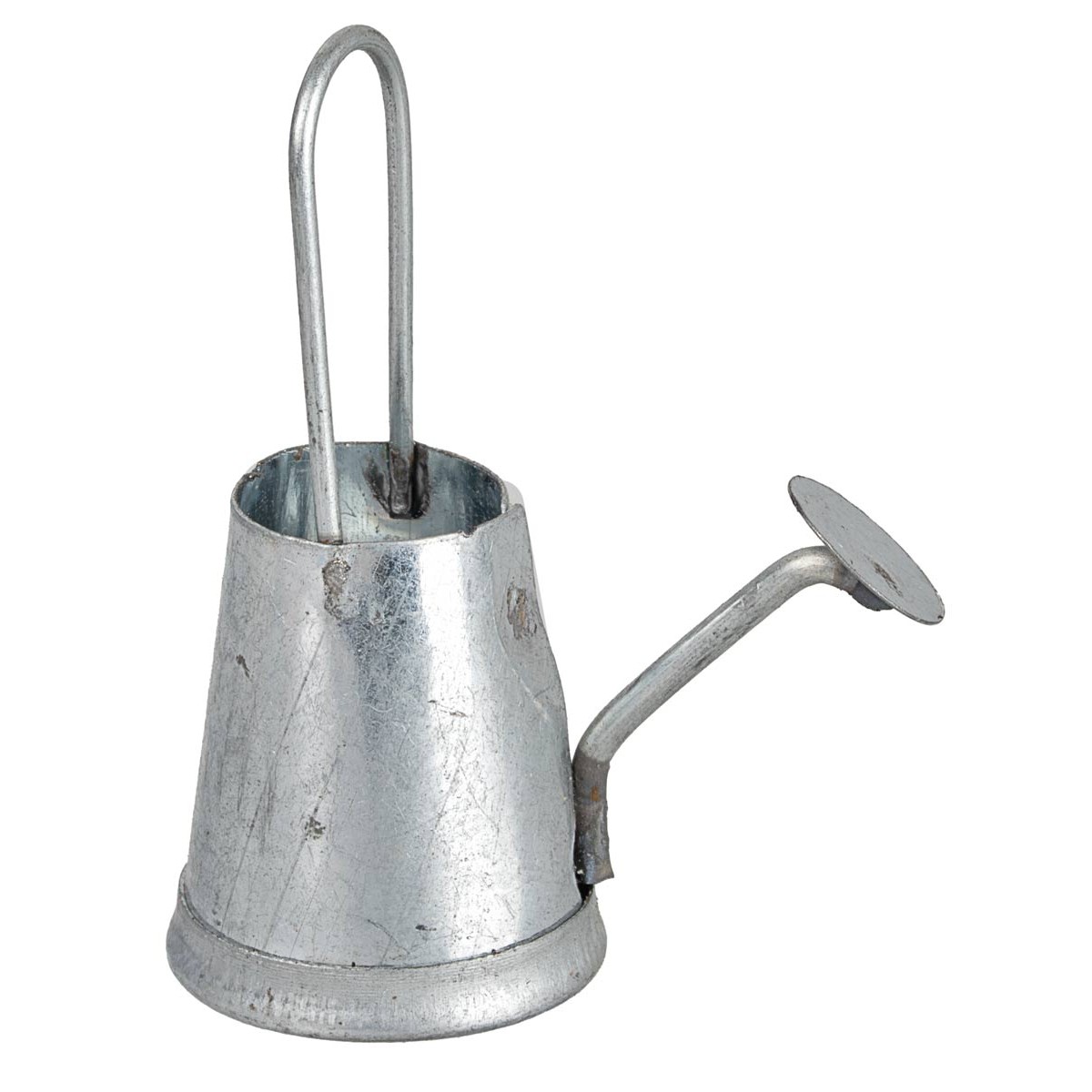 Annaffiatoio in metallo con manico ad arco e beccuccio con rosetta.