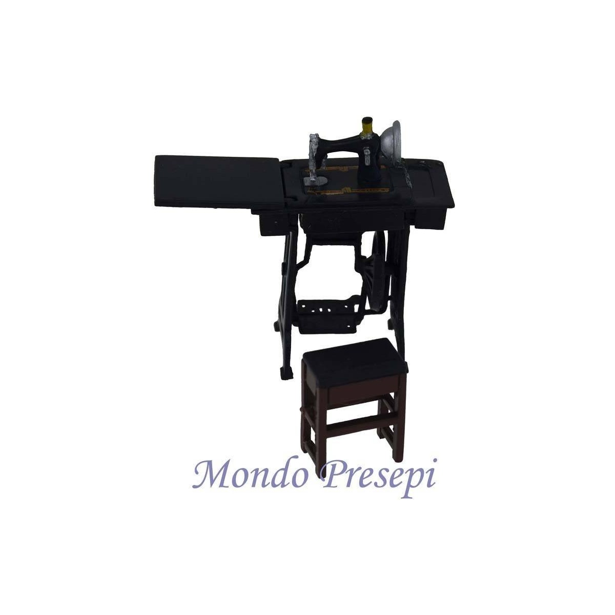 Banco con macchina da cucire e attrezzi per sarta.