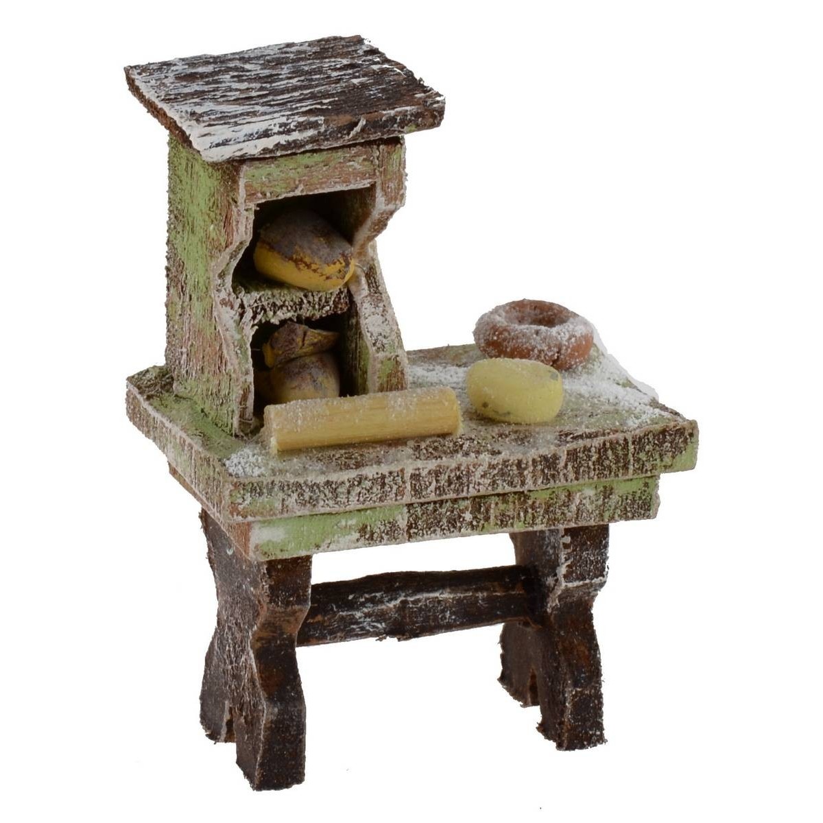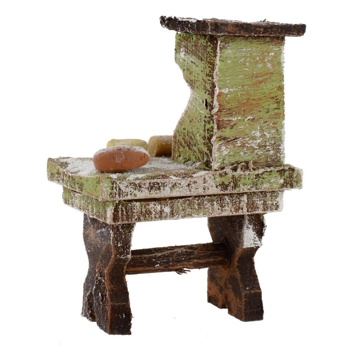 Banco in legno da lavoro di un fornaio per Presepe, dotato di minuterie in terracotta e legno, realizzato interamente a mano e consigliato per statue di altezza cm 6.