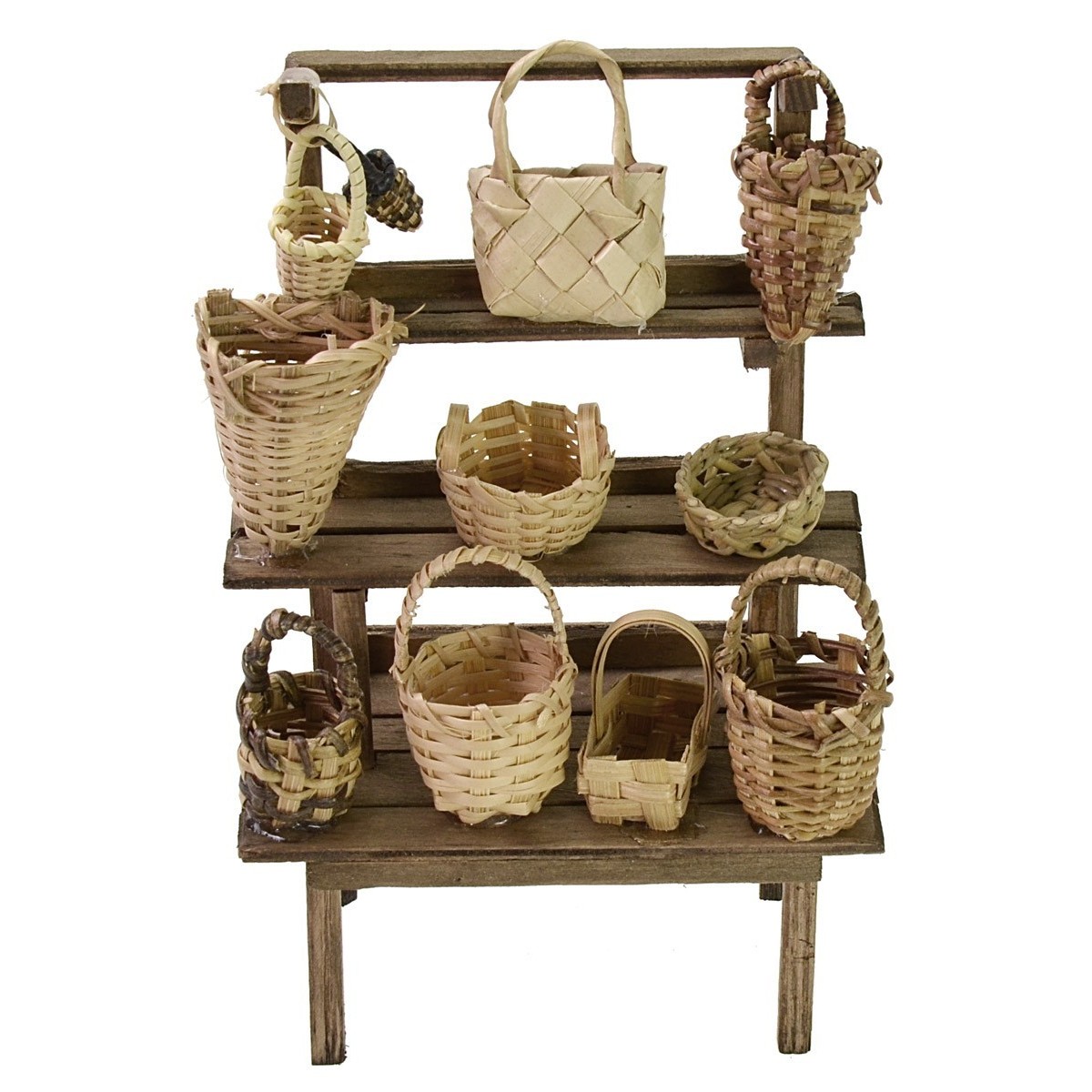 Bancarella realizzata artigianalmente in legno, allestita con accessori in vimini (cesti, borsa e gerle). Consigliata per statue di altezza 12-14 cm.