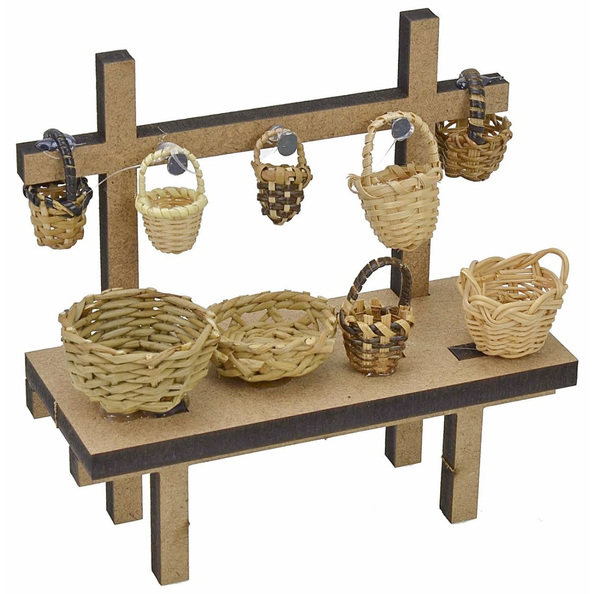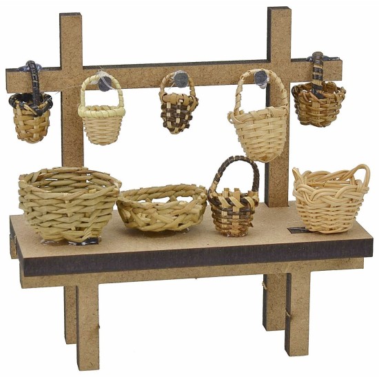 Bancarella realizzata artigianalmente in legno, allestita con cesti in vimini assortiti. Consigliata per statue di altezza 10-12 cm.