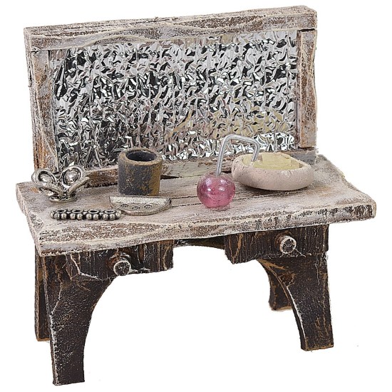 Banco per barbiere con specchio e attrezzi da lavoro, consigliato per statue da 10 cm, ideale per la creazione di botteghe nel vostro Presepe.