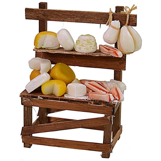Bancarella con esposizione di salumi e formaggi assortiti, realizzato artigianalmente da sapienti mani italiane utilizzando il legno per la struttura e cera dipinta per la minuteria. Il prodotto risulta ben rifinito nei dettagli, consigliato per donare un tocco di originalità al proprio Presepe ed adatto a statue di altezza 10-12 cm in base ai propri gusti e preferenze.