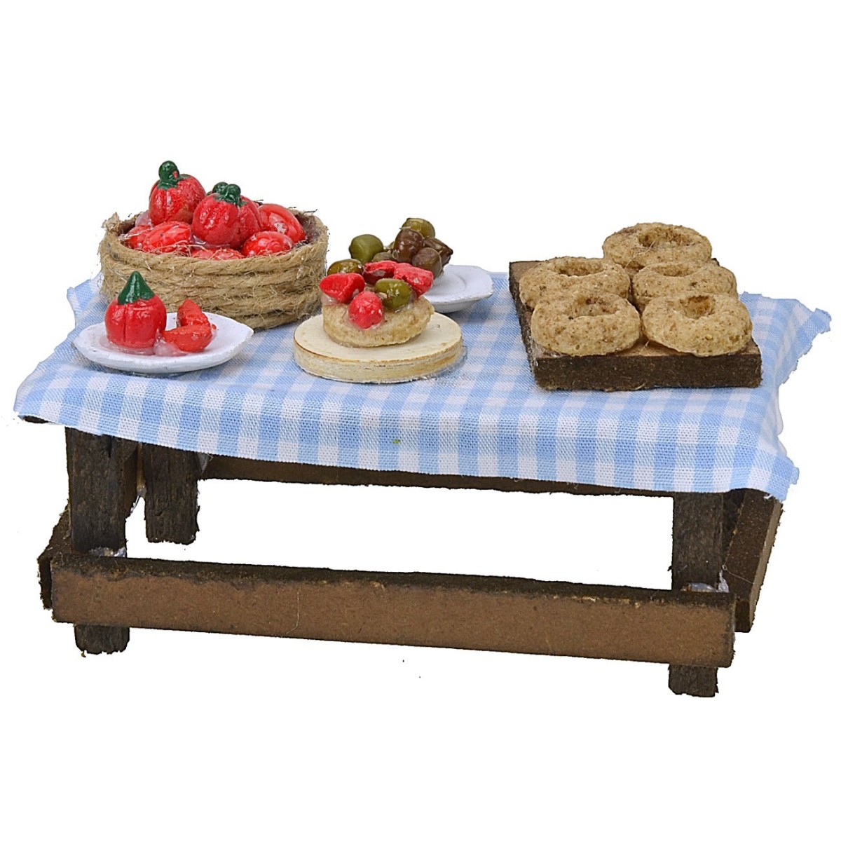 Banco da cucina realizzato artigianalmente in Italia con struttura in legno, il piano è coperto da una tovaglia a quadri dove sono riposti diversi alimenti necessari alla preparazione della caponata. Questo articolo è consigliato per statue altezza da 9 a 10 cm e si precisa che essendo prodotto a mano potrebbe leggermente variare rispetto alla foto. Nella sezione MINUTERIE sono disponibili tanti accessori per presepe da abbinare.