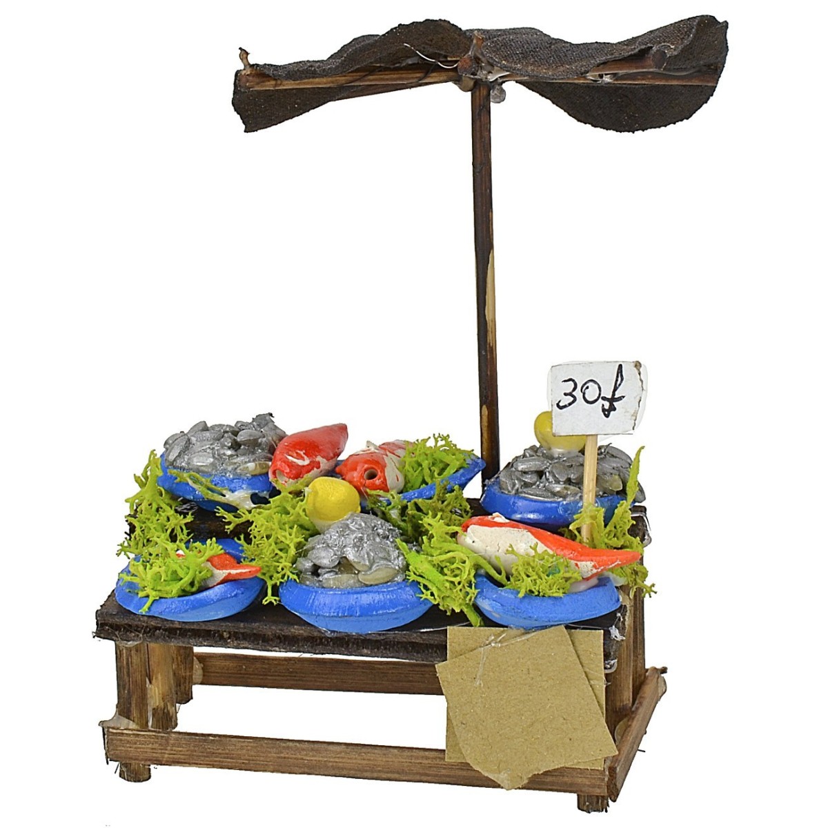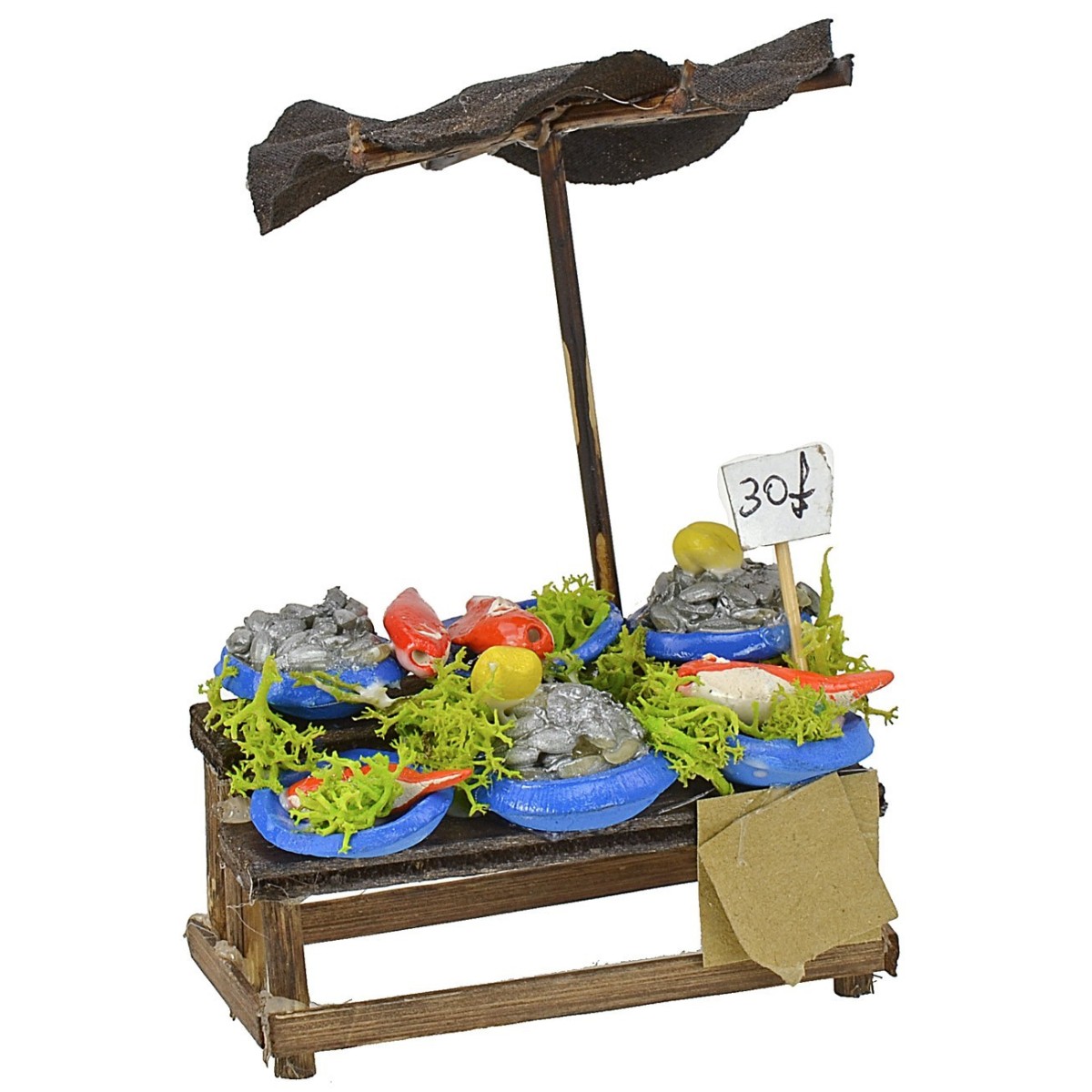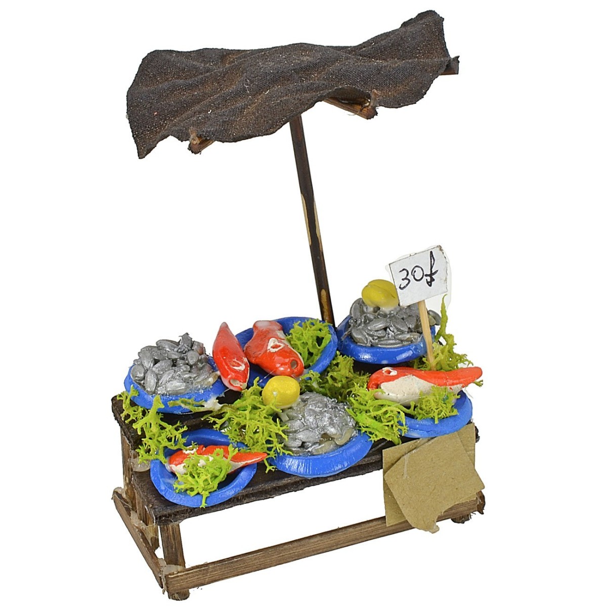 Bancarella per pescivendolo con ombrellone realizzata artigianalmente in Italia con struttura in legno, sul banco sono esposti cesti colmi di pesci assortiti . Questo articolo è consigliato per statue altezza da 8 a 10 cm e si precisa che essendo prodotto a mano potrebbe leggermente variare rispetto alla foto. Nella sezione MINUTERIE sono disponibili tanti accessori per presepe da abbinare.