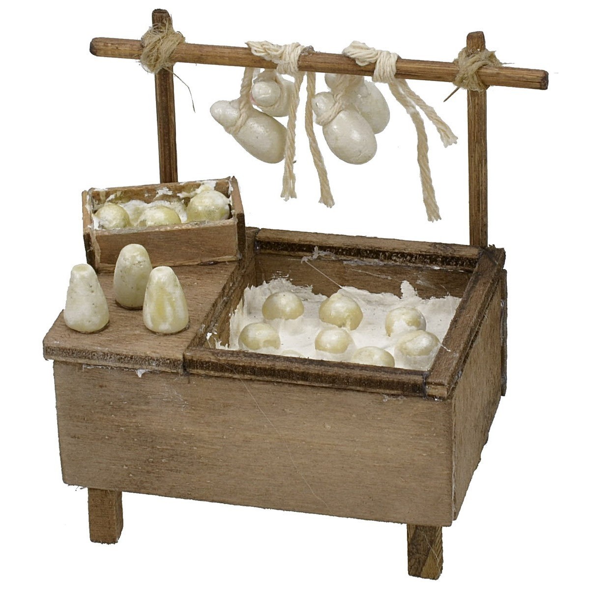 Banco con formaggi freschi e vasca con mozzarelle. Questo articolo è stato realizzato da artigiani italiani ed consigliato per statue altezza 10-12 cm. Si precisa che essendo un articolo artigianale prodotto a mano potrebbe leggermente variare rispetto alla foto. Nella sezione MINUTERIE sono disponibili tanti accessori per presepe da abbinare per personalizzare ed arricchire questo prodotto.