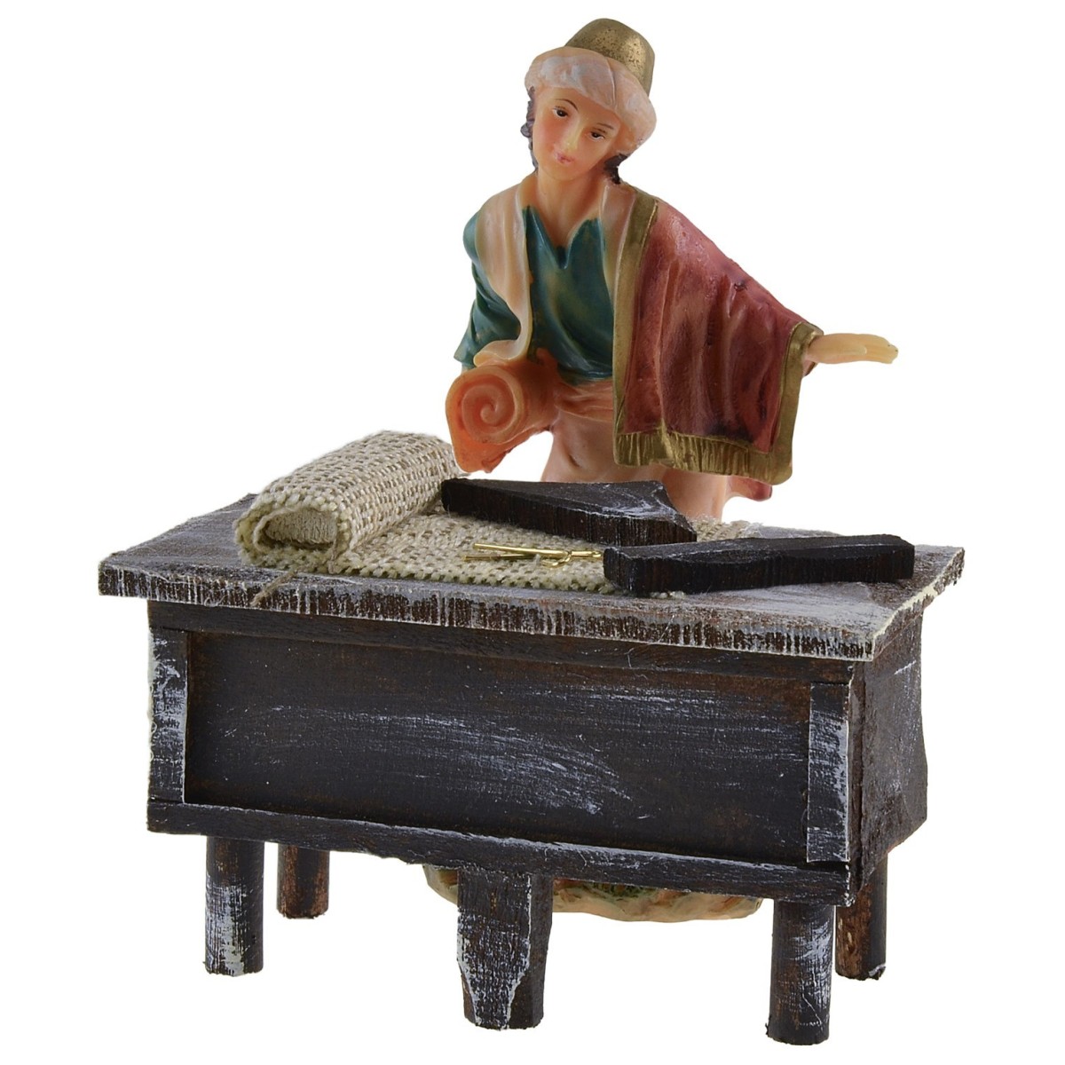 Banco in legno per sarto, con stoffa e utensili per il taglio di quest'ultima. Si consiglia l'utilizzo con figure della serie 12 cm, come in fotografia. Si precisa che le foto con le statuine sono solo a scopo dimostrativo, ma sono acquistabili separatamente nei prodotti correlati sotto la tabella. Ideale per la creazione di fiere o mercati nel vostro Presepe. L'articolo è stato realizzato a mano da artigiani italiani.
