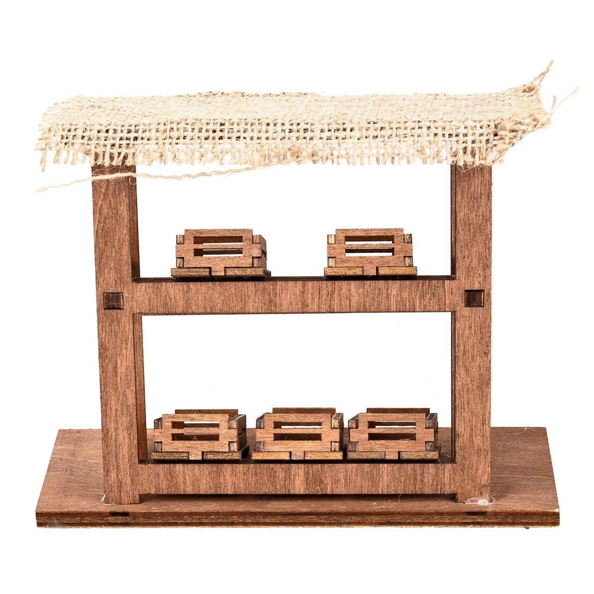 Bancarella in legno composta da cassette inclinate disposte su due livelli, con copertura in tessuto grezzo effetto juta. La struttura, interamente realizzata in legno, è adatta per realizzare ambientazioni da mercato o bottega.