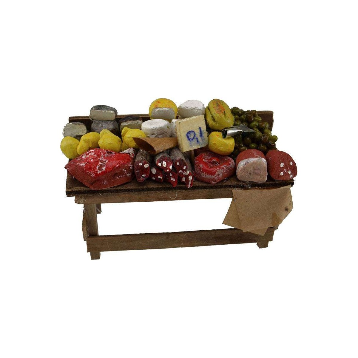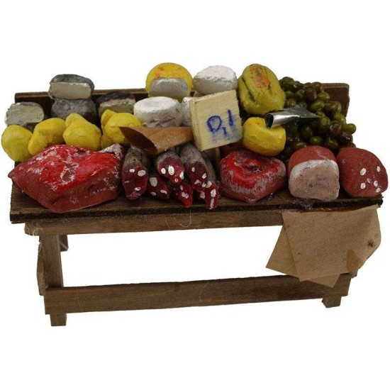 Bancarella in legno con salumi e formaggi, consigliata per statue altezza 10-12 cm.