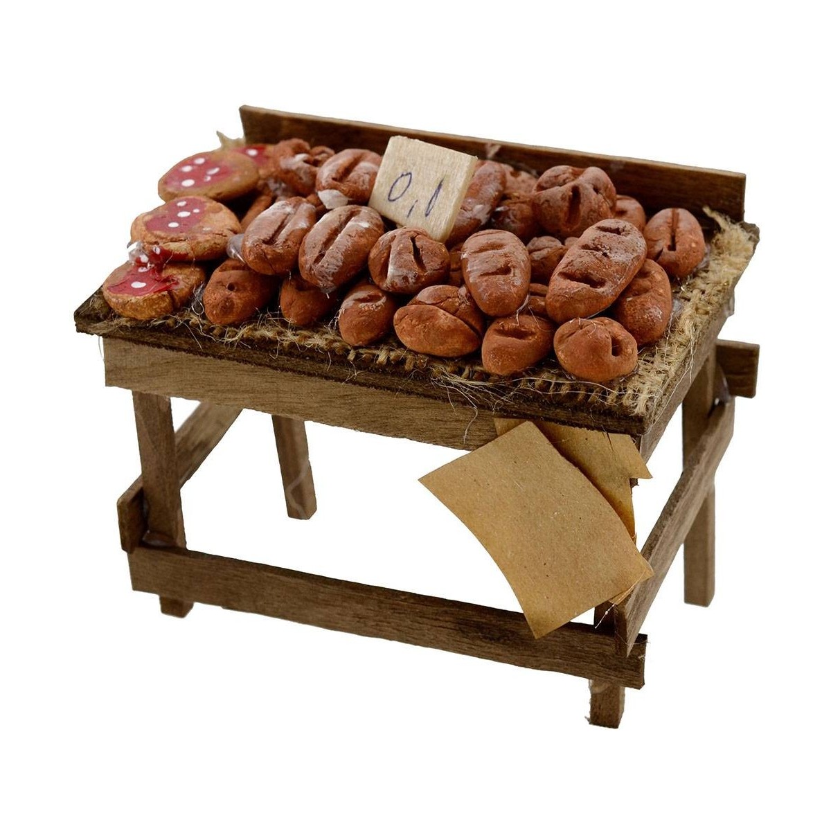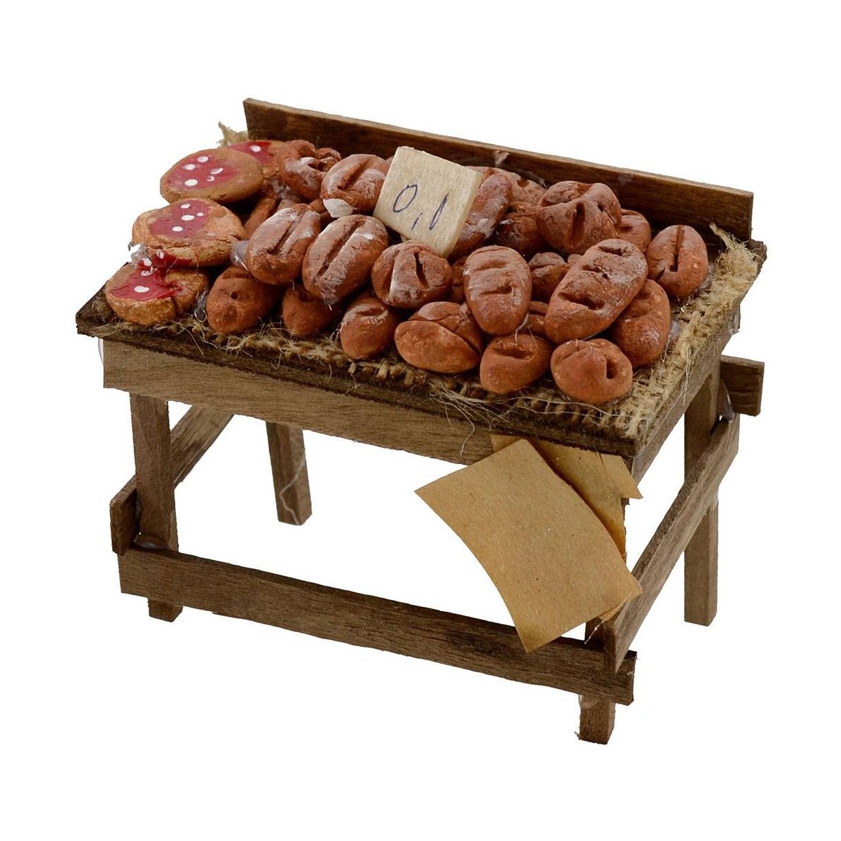 Banco in legno con pane e pizze in terracotta realizzato interamente a mano, consigliato per statue di altezza cm 12-15.
