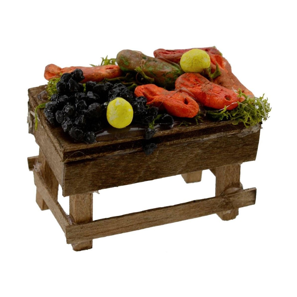 Banco in legno del pescivendolo con pesce in terracotta realizzato interamente a mano, consigliato per statue di altezza cm 6,5-8. Si precisa che essendo prodotti artigianali il pesce esposto può variare rispetto alla foto.