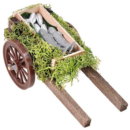 Carretto in legno del pescivendolo con pesci assortiti, articolo consigliato per statue altezza cm 10-12 cm. Prodotto realizzato artigianalmente in Italia.