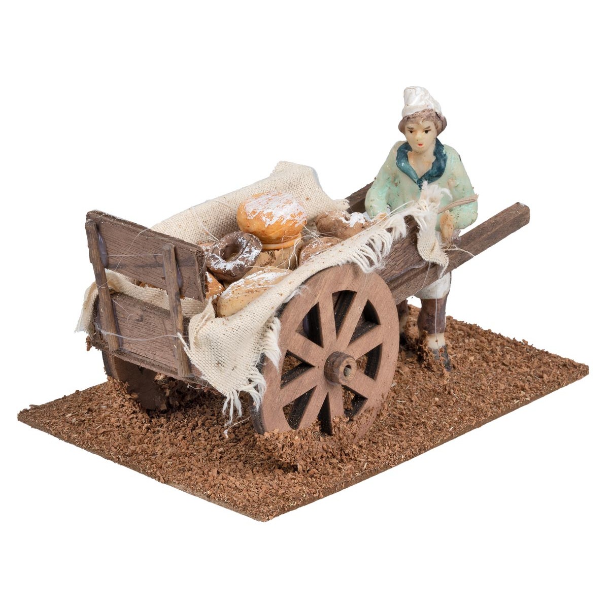 Carretto in legno ricco di pane, accompagnato da un fornaio in resina dipinta di 9 cm.