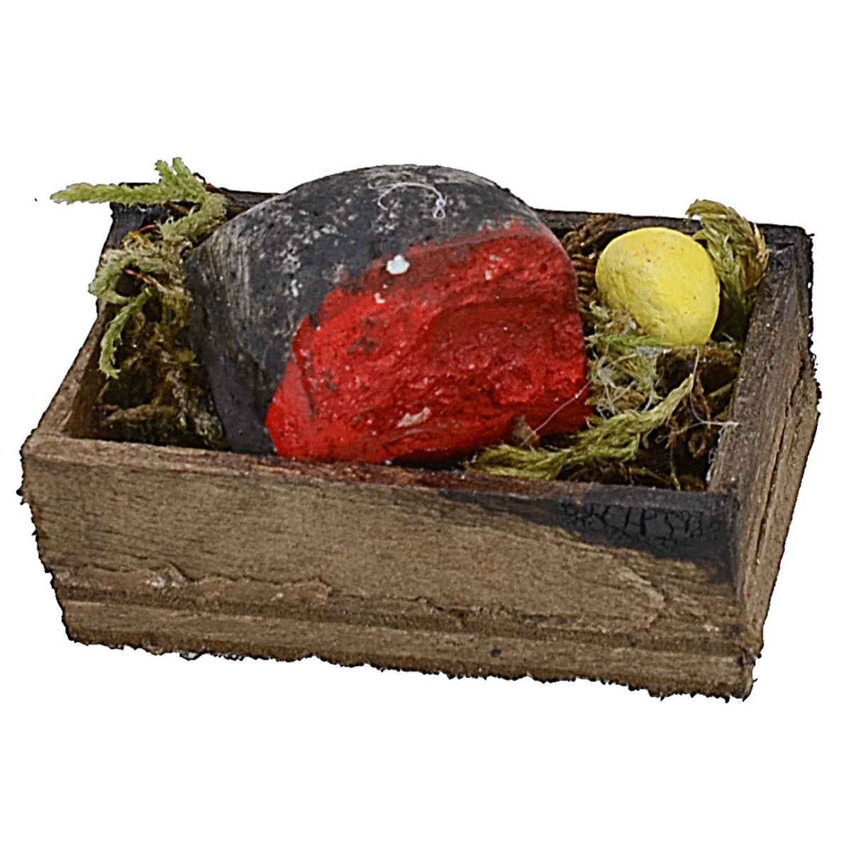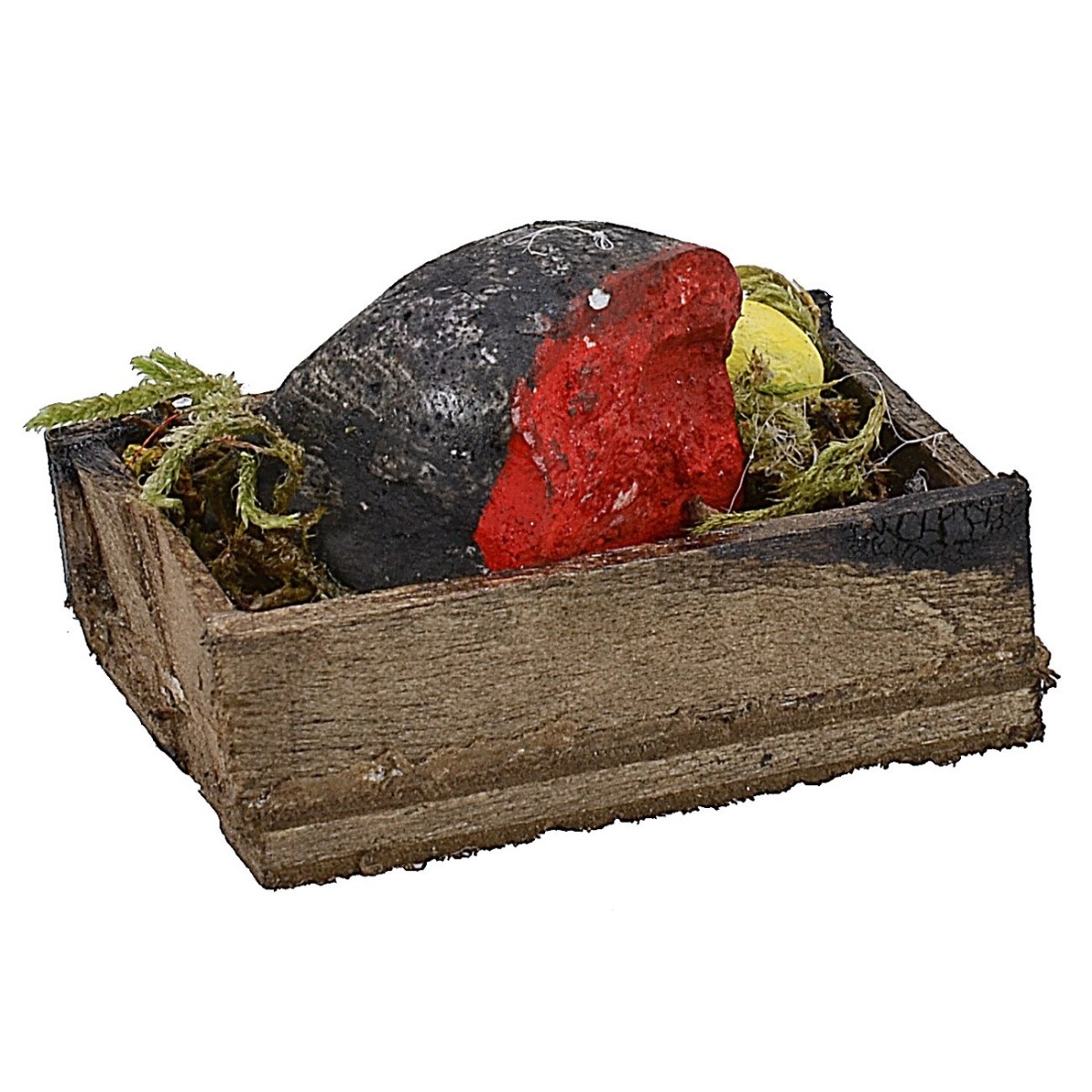Cassetta di legno con trancio di pesce spada, questo articolo è consigliato per statue di altezza 10-12 cm e potrebbe esser utilizzato per arricchire la bancarella di un pescivendolo
