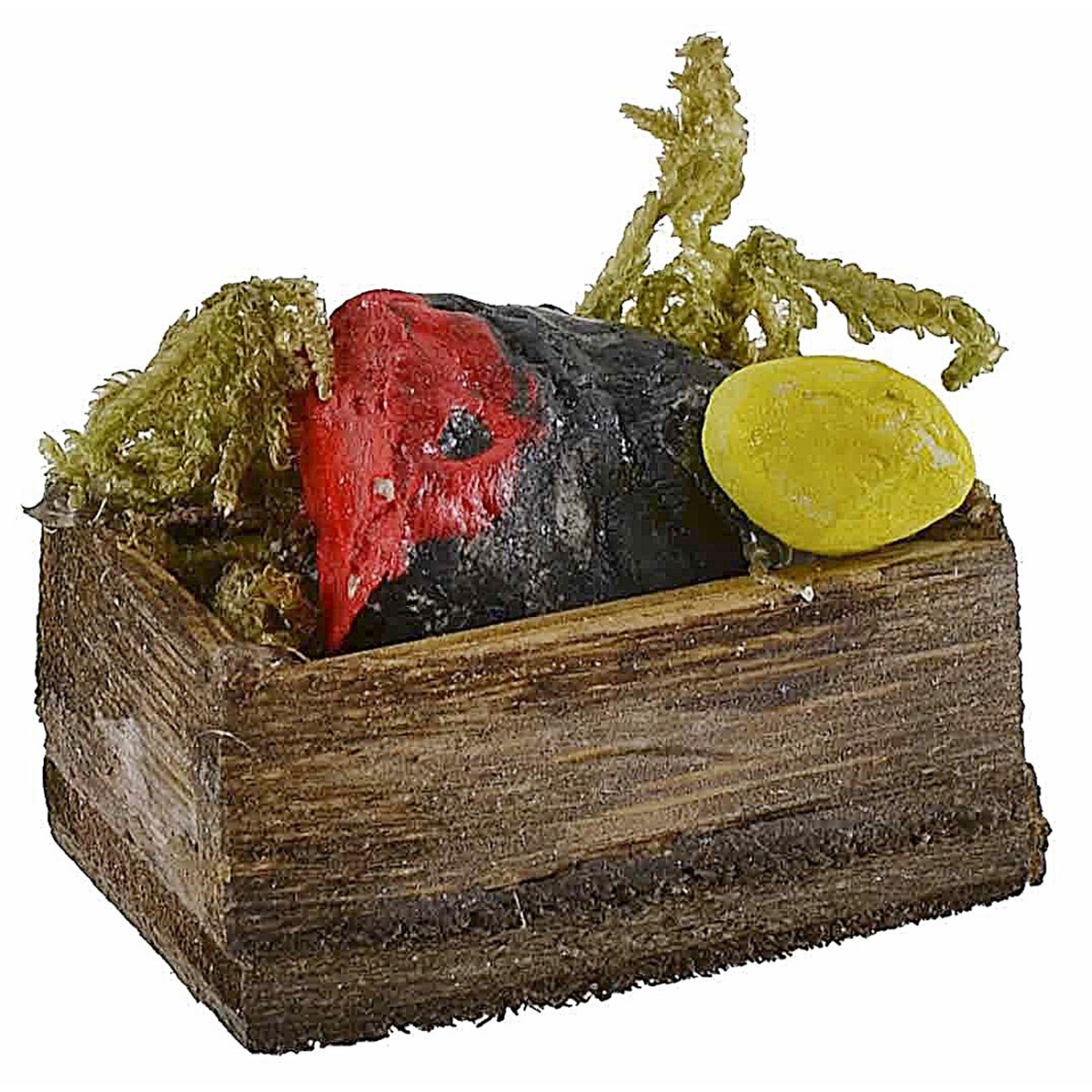 Cassetta realizzata artigianalmente in legno contenente un trancio di pesce spada con limone. L'accessorio in miniatura è utile per decorare il presepe fai da te ed è consigliato per statuine di altezza da 8 a 10 cm.