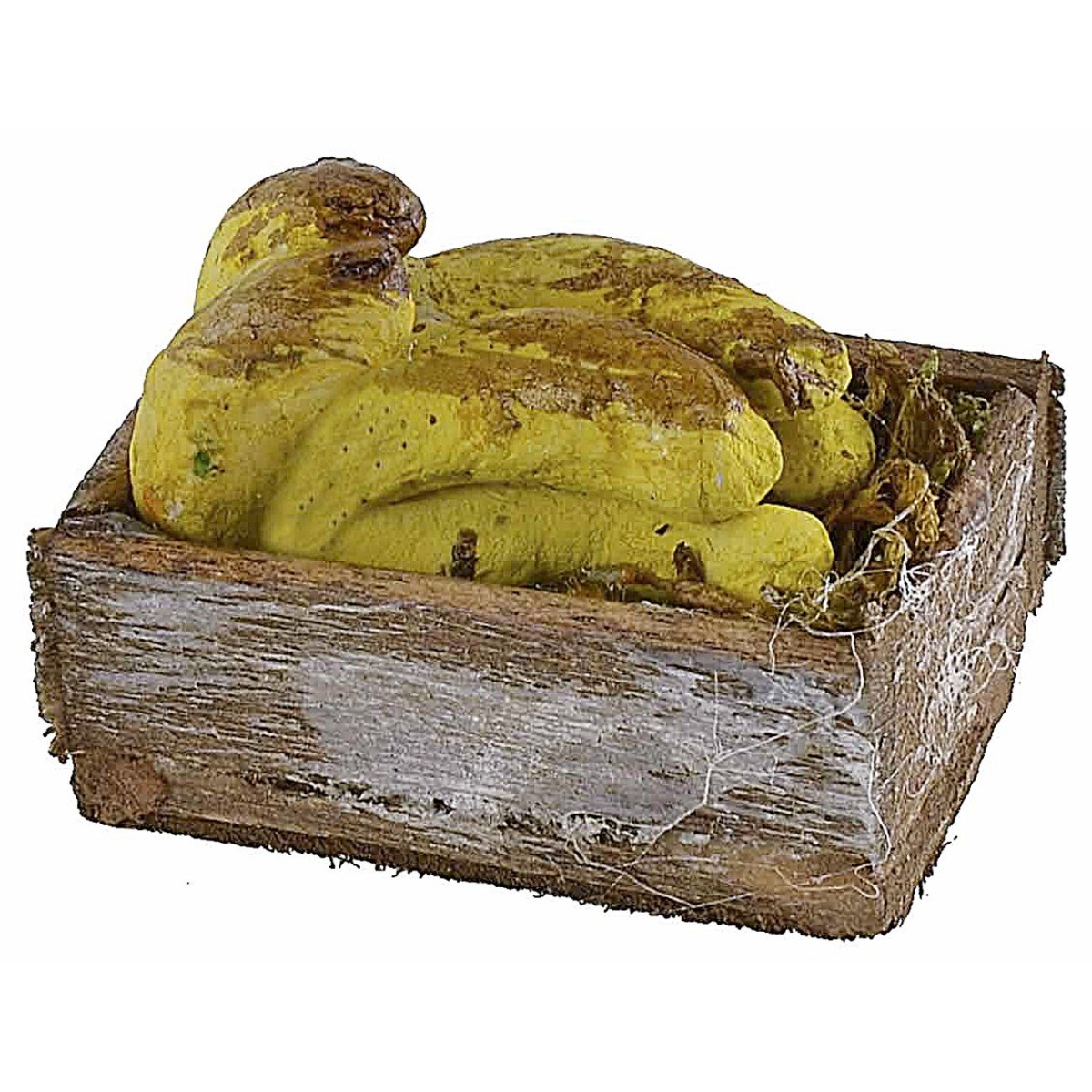 Cassetta realizzata artigianalmente in legno contenente delle banane. L'accessorio in miniatura è utile per decorare il presepe fai da te ed è consigliato per statue di altezza da 8 a 10 cm.