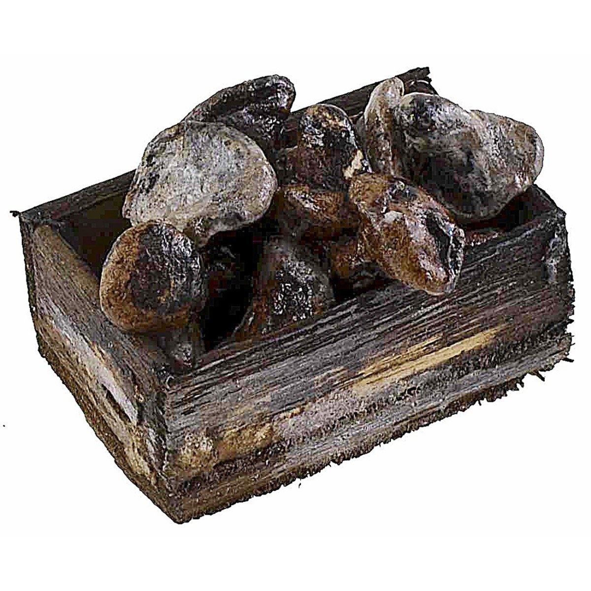 Cassetta realizzata artigianalmente in legno contenente dei funghi. L'accessorio in miniatura è utile per decorare il presepe fai da te ed è consigliato per statue di altezza da 8 a 10 cm.