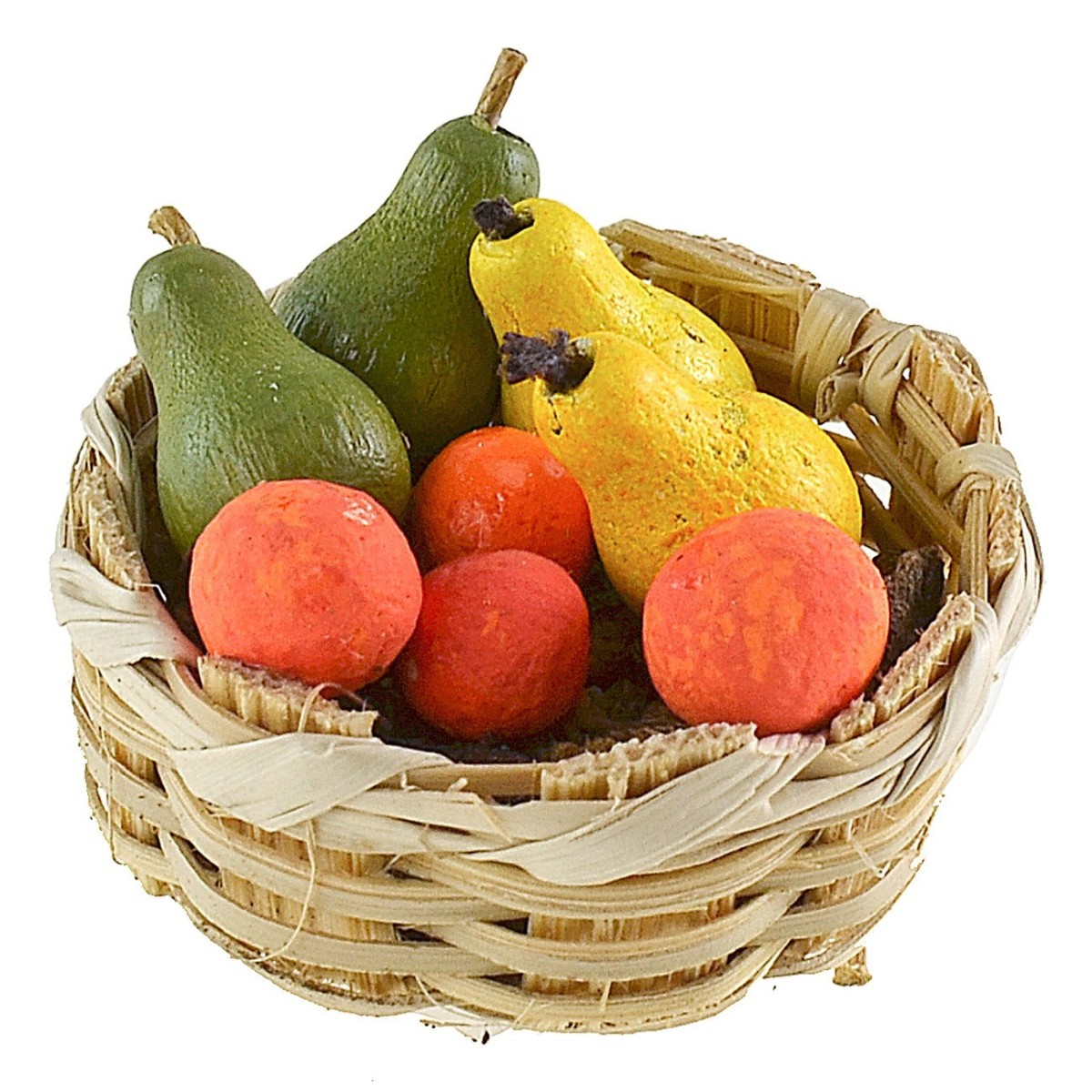 Cesto rotondo in vimini ricolmo di arance e pere. L'accessorio in miniatura è utile per decorare il presepe fai da te ed è consigliato per statue di altezza 12 cm.