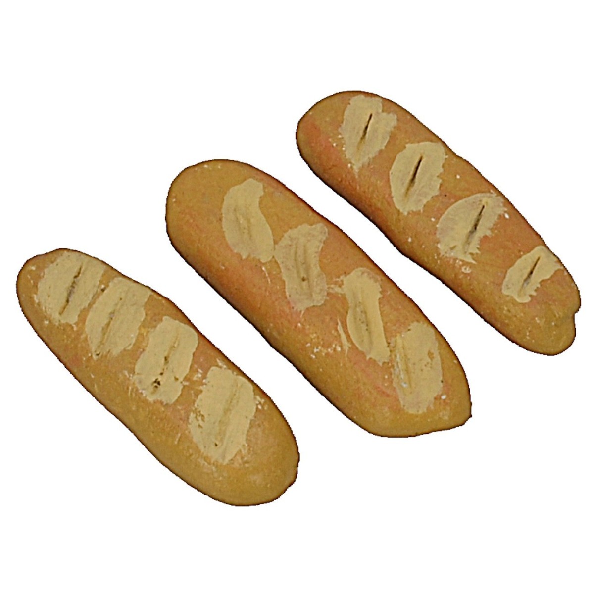 Set 3 pezzi di pane tipo ciabatta ben rifinita e dettagliata, è ideale per completare cesti, cassette e banchi da fornaio. L'articolo è consigliato per statue di altezza 10-12 cm.