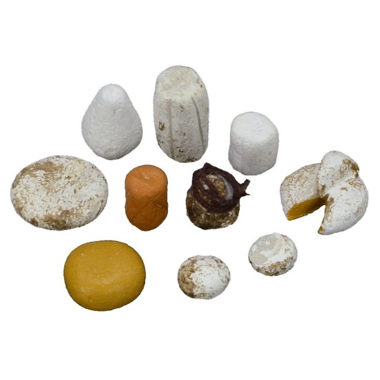 Set di 10 formaggi assortiti ideali per completare cesti, cassette e banchi da bottega alimentare. L'articolo è consigliato per statue di altezza 10-12 cm.