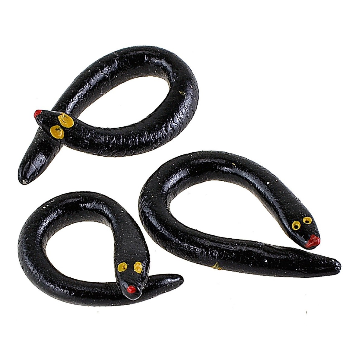 Confezione di tre anguille realizzate in terracotta dipinta. L'accessorio è consigliato per statuine di altezza da 8 a 10 cm ed è stato fatto artigianalmente in Italia.
