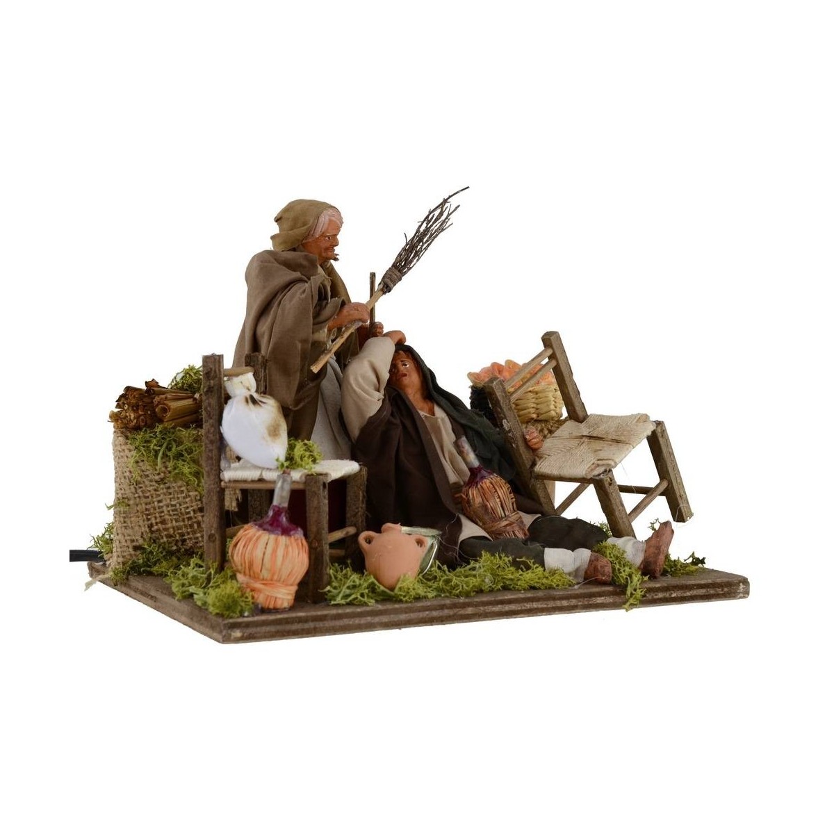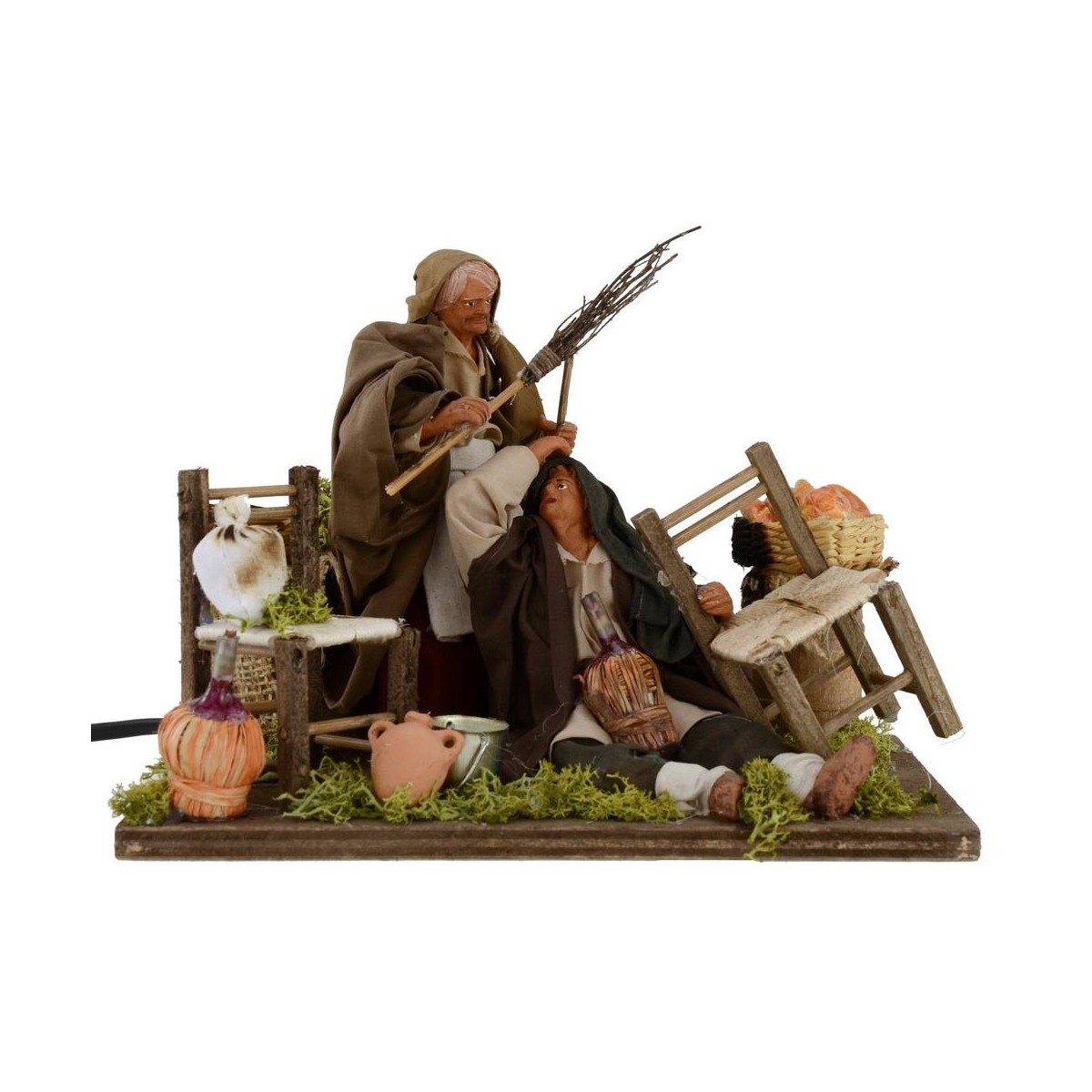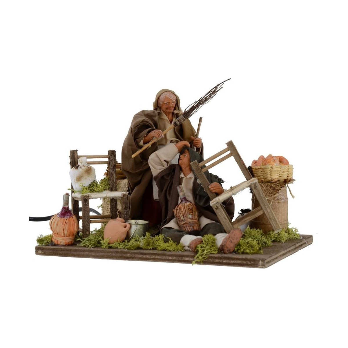 Donna che percuote il marito beone in movimento. La scena risulta molto ricca di dettagli: in primo piano vi è l'uomo, accasciato a terra con una damigiana, sostenuto dalla sedia che si trova al suo fianco. Dietro di lui, la moglie lo percuote con una scopa. Nella scenografia ritroviamo, inoltre, elementi come: un secchiello, un'anfora, una sedia, una damigiana, diversi sacchi bianchi, un cesto con del pane, una botte, un tavolo con una tovaglia rustica ed una fascina di paglia. Le statue sono realizzate in terracotta e dipinte a mano in Italia da sapienti mani artigiane con abiti in tessuto. Le statue per il Presepe classico e/o napoletano sono alte circa 14 cm la donna e circa 9,5 l'uomo accasciato, e la scena è caratterizzata dall'uso di materiali come il legno, la paglia, il metallo, la stoffa e la terracotta. Le statue fanno parte della serie da 15 cm.