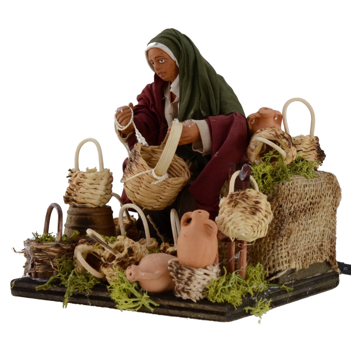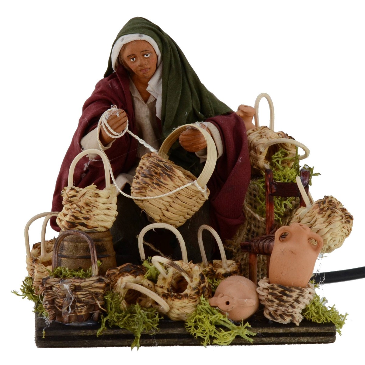 Riparatore di cesti in movimento. La scena risulta molto ricca di dettagli: in primo piano vediamo l'uomo, seduto, che grazie al movimento del braccio, simula l'azione di aggiustare un cesto in vimini. Tutt'intorno, adagiati a terra, notiamo la presenza di molteplici cesti. Altri elementi caratteristici della scena sono la verde vegetazione circostante, qualche botte, una sedia e diverse anfore. La statua è realizzata in terracotta e dipinta a mano in Italia da sapienti mani artigiane con abiti in tessuto ben rifiniti. La statua per il Presepe classico e/o napoletano misura, seduta, 10,5 cm ed è caratterizzata dall'uso di materiali come il legno, la stoffa e la terracotta; essa fa parte della serie di statue da 14 cm.