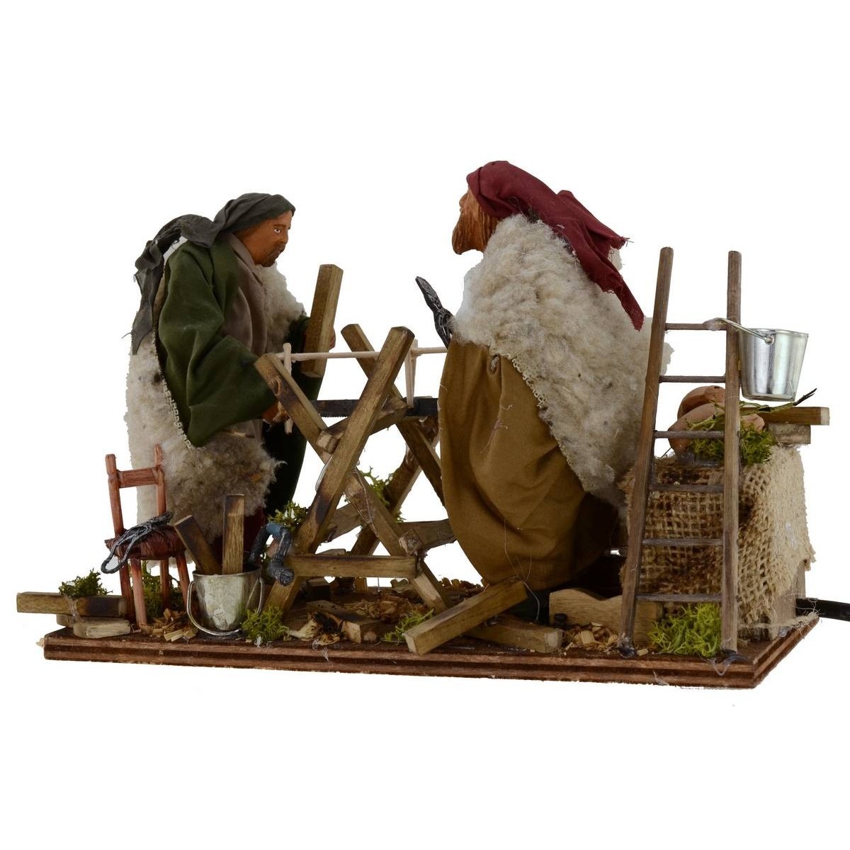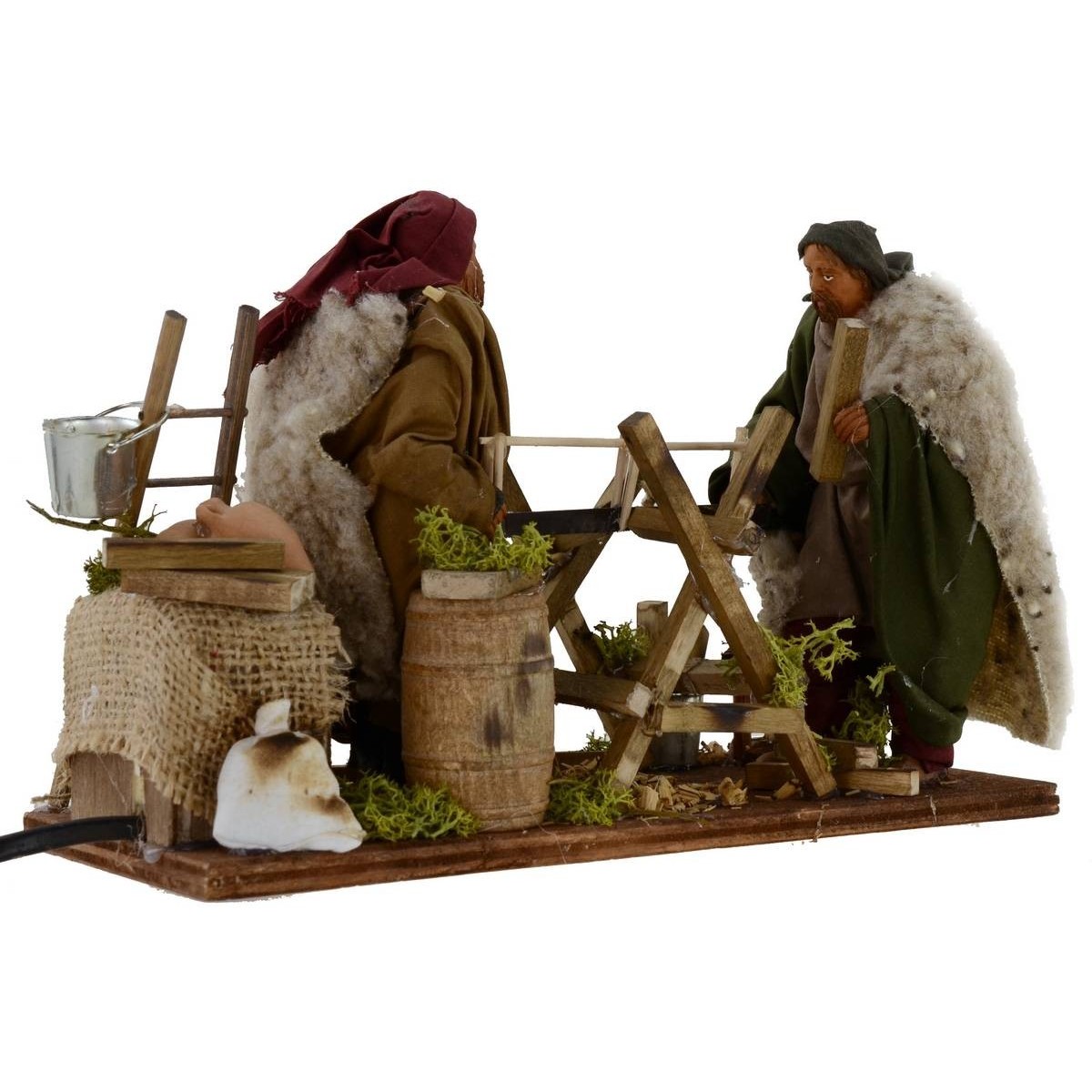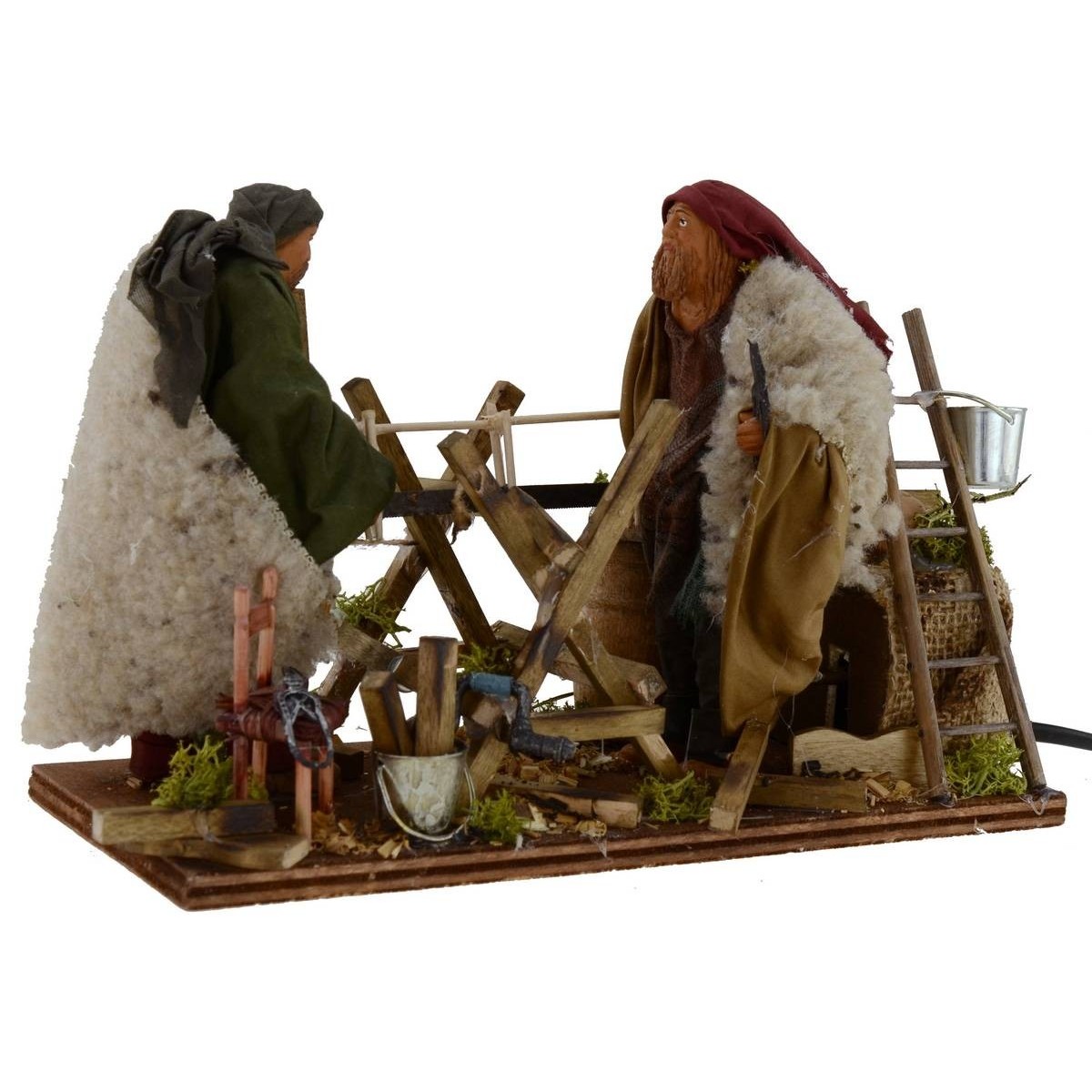 Coppia di boscaioli in movimento. Grazie al movimento delle loro braccia, che si sporgono in avanti ed indietro, i boscaioli simulano l'azione di segare della legna simultaneamente. Tutt'intorno è possibile notare la presenza di anfore, secchielli, assi di legno, botti, vari strumenti da lavoro ed una scala. Inoltre, è caratteristica la verde vegetazione circostante. Le statue sono realizzate in terracotta e dipinte a mano in Italia da sapienti mani artigiane con abiti in tessuto ben rifiniti. Le statue per il Presepe classico e/o napoletano misurano dai 13 cm ai 14 cm e sono caratterizzate dall'uso di materiali come il legno, la stoffa e la terracotta; La composizione fa parte della serie di statue da 14 cm.