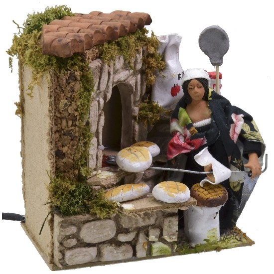 Fornaia in movimento funzionante a corrente. La scena risulta ricca di dettagli ed in primo piano vediamo la donna, in piedi, intenta girare con l'apposita pala una pagnotta di pane all'interno del forno. Sono presenti, inoltre, molteplici minuterie ben rifinite di pagnotte e filoni di pane, oltre a sacchi di farina e barattoli di sale e pepe. Ciuffetti di vegetazione creati con muschio e lichene completano la scenografia. La statua è realizzata in terracotta e dipinta a mano in Italia da mani artigiane con abiti in tessuto ed è dotata di una spina funzionante a corrente. La statua per il Presepe classico e/o napoletano è caratterizzata dall'uso di materiali come il legno, la stoffa e la terracotta; essa fa parte della serie di statue da 14 cm.