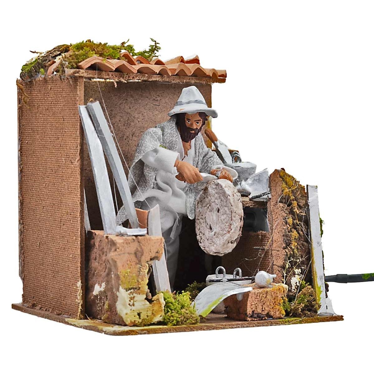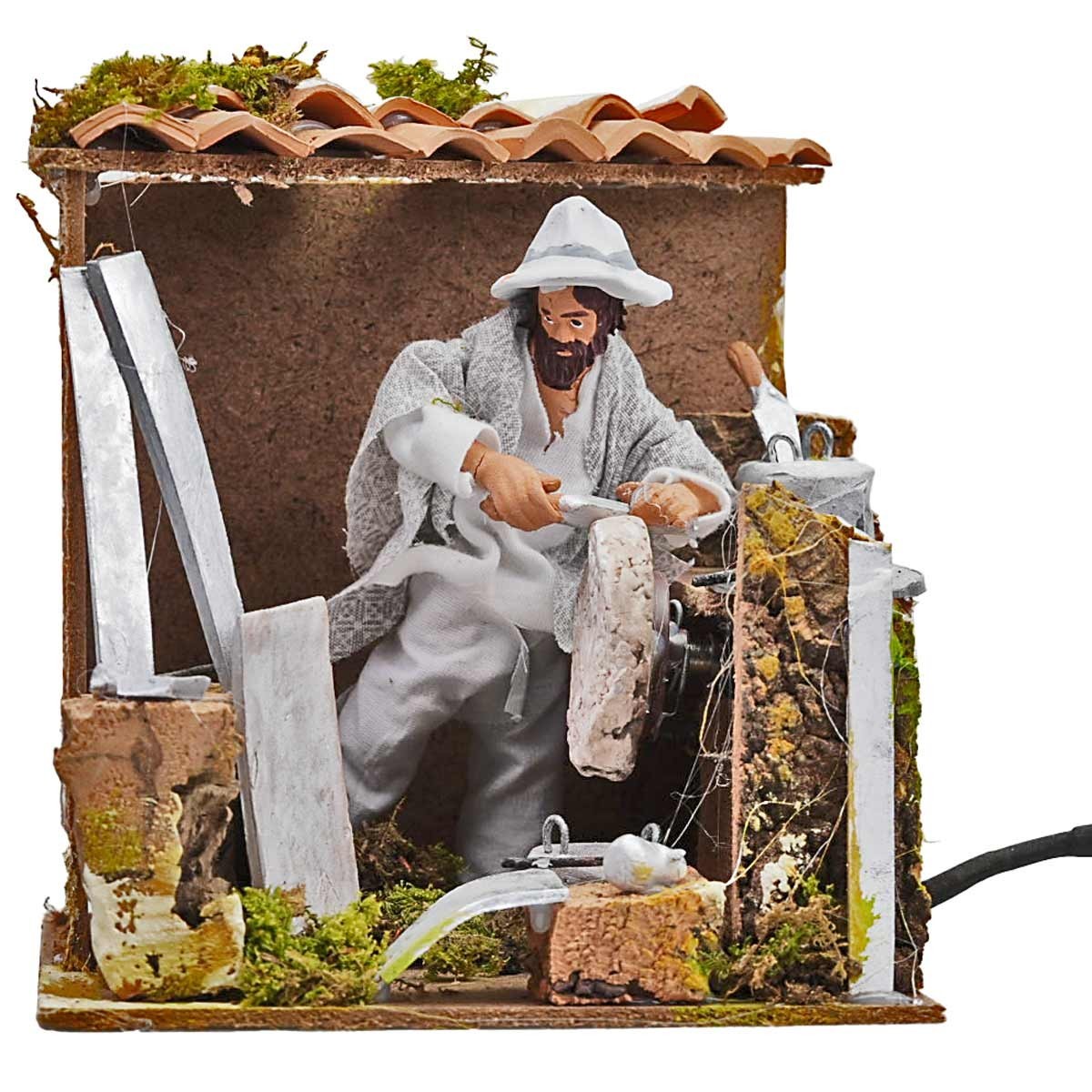 La scena per Presepe raffigura un arrotino in movimento che affila i coltelli. La scena risulta molto ricca di dettagli come attrezzi da lavoro. La statua è realizzata in terracotta e dipinta a mano in Italia da sapienti mani artigiane con abiti in tessuto. Ottimo prodotto per rendere unico ed originale il vostro Presepe.