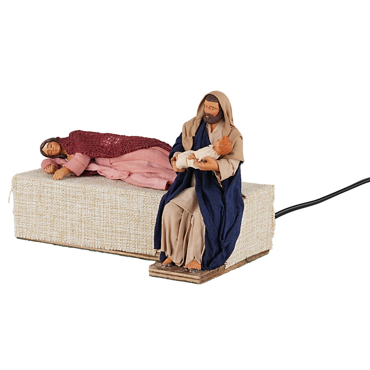 Natività che rappresenta Maria che dorme, mentre Giuseppe, grazie al suo movimento del busto, culla Gesù Bambino. La statuina è realizzata in terracotta e dipinta a mano in Italia da sapienti mani artigiane con abiti in tessuto ben rifiniti. La figura per il Presepe classico e/o napoletano è realizzata in terracotta ed è funzionante a corrente. Si precisa che i particolari del prodotto possono variare in quanto realizzato artigianalmente.