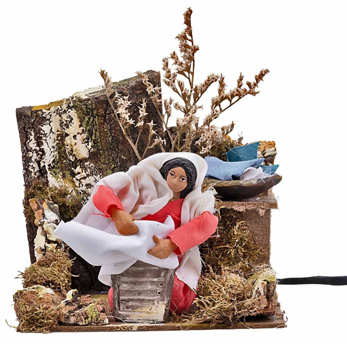 Donna che con il movimento del busto, simula l'azione di lavare i panni. La statuina è realizzata in terracotta, dipinta a mano in Italia, vestita con abiti in tessuto e funzionante a corrente. Si precisa che alcuni dettagli del prodotto possono variare, garantendo l'unicità di ogni pezzo, poiché interamente realizzato a mano.