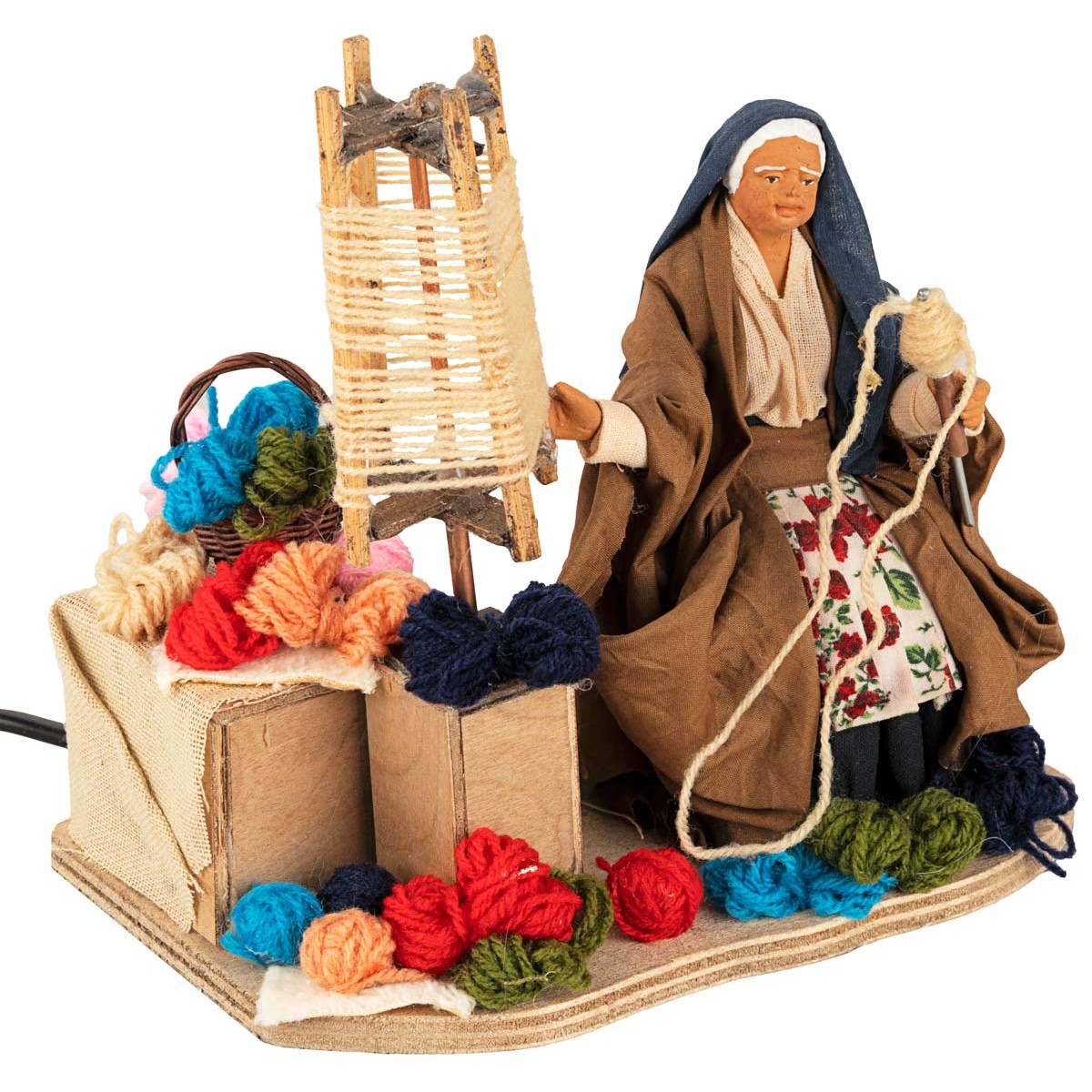 Filalana in movimento 14 cm. La donna è seduta e in mano ha un gomitolo di lana, con l'altra ruota la struttura dove è attorcigliato il filo, ricordando il movimento in modo realistico. Altri elementi come dei gomitoli di lana sono sparsi e decorano la scena. La statua è realizzata in terracotta e dipinta a mano in Italia da sapienti mani artigiane con abiti in tessuto ben rifiniti. La statua per il Presepe classico e/o napoletano è caratterizzata dall'uso di materiali come il legno, la stoffa e la terracotta ed è funzionante a corrente. Si precisa che i particolari del prodotto possono variare in quanto realizzato interamente a mano.