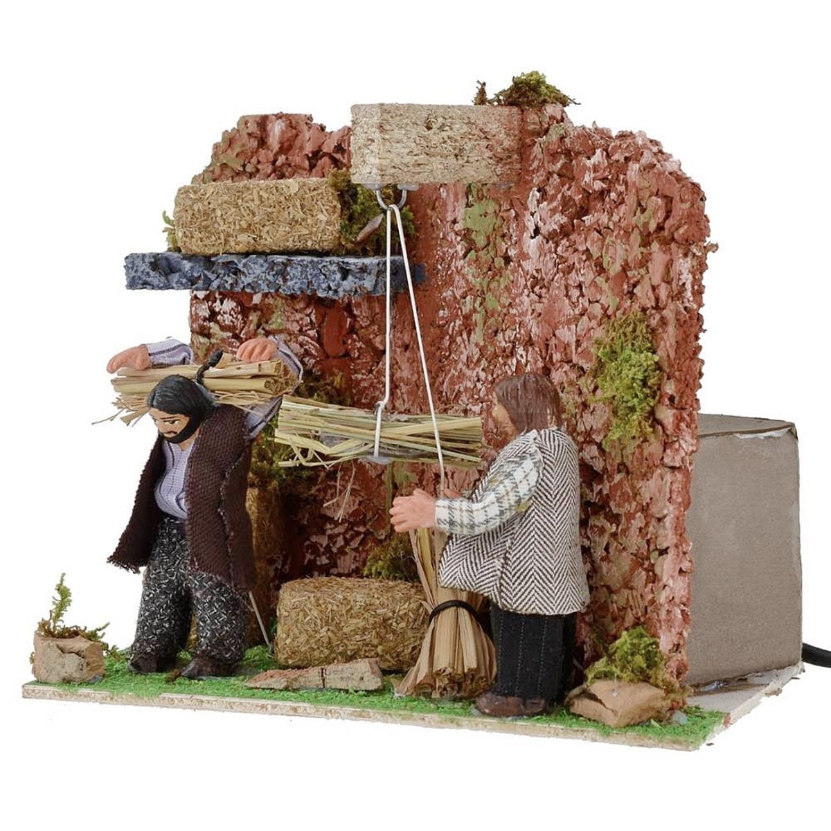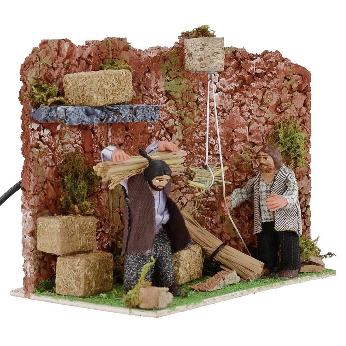 Contadini nel fienile con doppio movimento, funzionante a corrente. La scena risulta ben rifinita: in primo piano vediamo un personaggio calare una fascina di paglia dall'alto verso il basso, mentre l'altro è intento a sollevarla a spalle. Tutt'intorno, nella scenografia, sono presenti balle e fascine di paglia. Le statue sono realizzate in terracotta e dipinte a mano in Italia da mani artigiane con abiti in tessuto e la scenografia è dotata di una spina funzionante a corrente che permette il doppio movimento. Le statue per il Presepe classico e/o napoletano misurano 8 cm e sono caratterizzate dall'uso di materiali come il legno, il sughero, la stoffa e la terracotta.