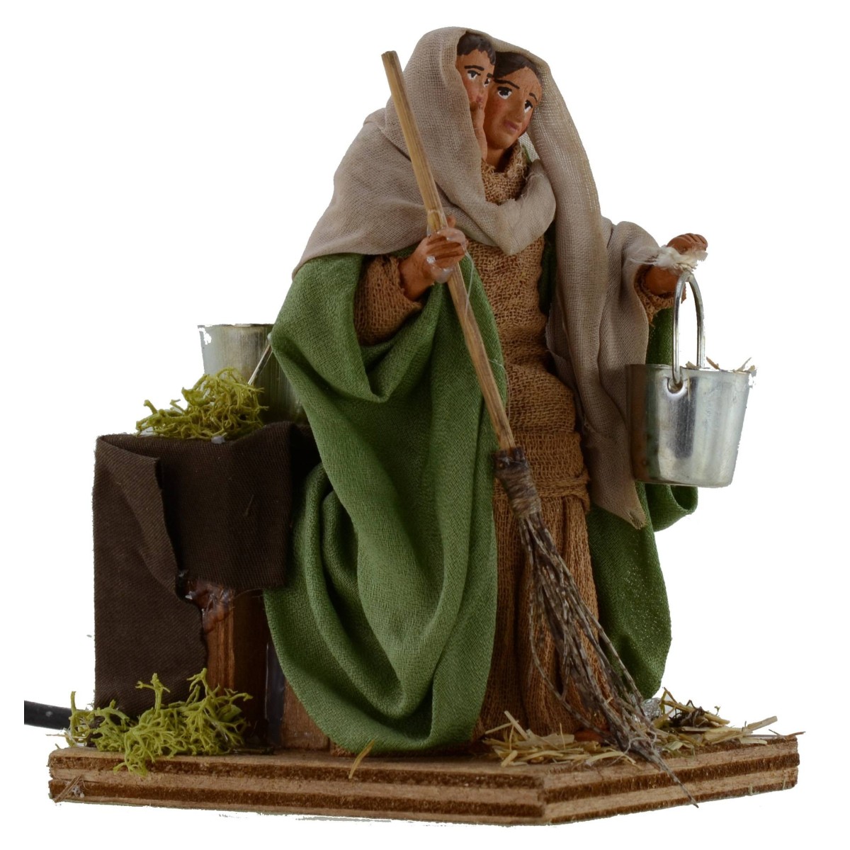Donna che spazza in movimento. La scena risulta molto ricca di dettagli: in primo piano vediamo la donna, che tiene in braccio il suo bambino, intenta a spazzare per terra. Grazie al movimento del suo busto, che si abbassa e si rialza, simula l'azione di raccogliere la paglia appena spazzata e riporla nel secchiello che tiene nell'altra mano. Tutt'intorno, adagiata a terra, notiamo la presenza della paglia. Dietro la statua, sono invece presenti due secchielli. Altri elementi caratteristici della scena sono la verde vegetazione circostante. La statua è realizzata in terracotta e dipinta a mano in Italia da sapienti mani artigiane con abiti in tessuto ben rifiniti. La statua per il Presepe classico e/o napoletano misura 11 cm ed è caratterizzata dall'uso di materiali come il legno, la stoffa e la terracotta; essa fa parte della serie di statue da 12 cm.