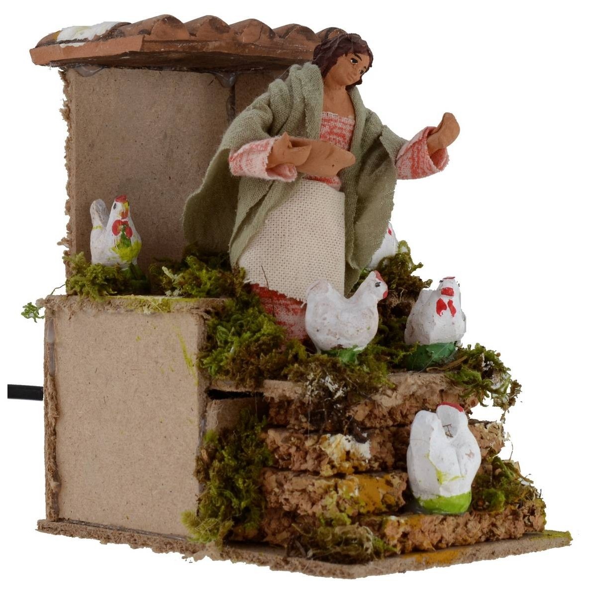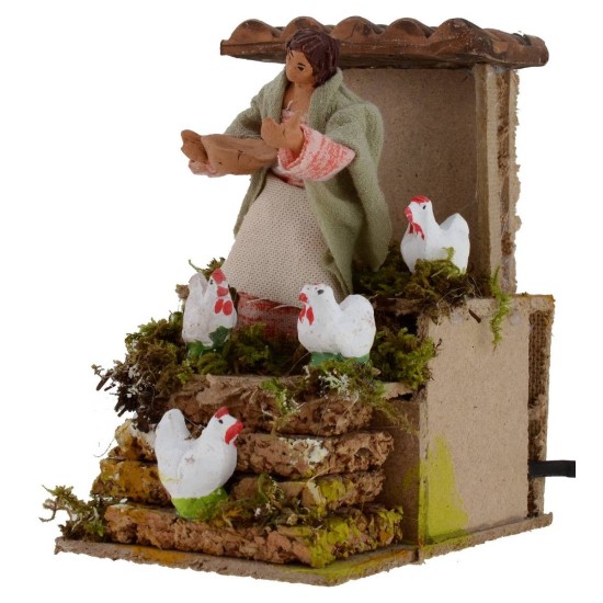 Donna che ciba le galline in movimento. La scena risulta ricca di dettagli: in primo piano vediamo la donna, intenta a cibare le galline grazie al movimento del suo busto, che si alza e si abbassa, simulando proprio l'azione di chinarsi per adagiare il cibo a terra. Tutt'intorno, notiamo la presenza di numerose galline. La statua è realizzata in terracotta e dipinta a mano in Italia da mani artigiane con abiti in tessuto. La statua per il Presepe classico e/o napoletano misura 9,5 cm ed è caratterizzata dall'uso di materiali come il legno, la stoffa e la terracotta e il sughero; essa fa parte della serie di statue da 10 cm. Si precisa che alcuni particolari della struttura potrebbero variare essendo un prodotto artigianale.