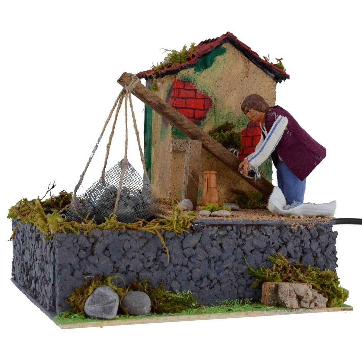 Pescatore con bilancino in movimento, funzionante a corrente. La scena risulta ricca di dettagli: in primo piano vediamo l'uomo, di profilo e chinato, intento a girare il bilancino per alzare il gran raccolto di pesce, contenuto nella rete e, grazie al movimento del busto che si muove in avanti ed indietro, simula proprio l'azione in modo molto naturale. Altri elementi caratteristici della scena sono le molteplici minuterie presenti: la rete colma di pesce, un'anfora, e del pesce appena pescato adagiato a terra, che rendono la scenografia molto suggestiva e realistica. La scenografia è dotata anche di una casetta e presenta molti elementi naturali. La statua è realizzata in terracotta e dipinta a mano in Italia da mani artigiane con abiti in tessuto. La statua per il Presepe classico e/o napoletano misura realmente 9,5 cm ed è caratterizzata dall'uso di materiali come il legno, il sughero, la stoffa e la terracotta; essa fa parte della serie di statue da 10 cm.