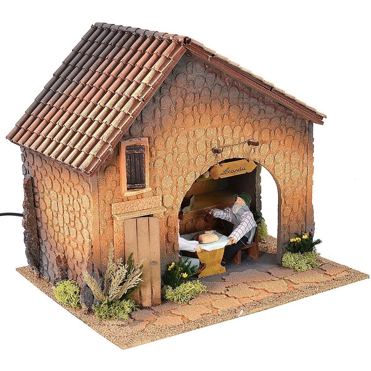 Osteria per presepe illuminata molto graziosa e rifinita nei minimi dettagli: muri in pietra, i tetti con i coppi, infissi in legno, oltre che per tutte la vegetazione a decorazione. La scena presenta i movimenti di due uomini della serie 12 cm seduti cm al tavolo imbandito della locanda in cui stanno cenando, uno alza il bicchiere per bere e l'altro versa il vino dalla brocca, sullo sfondo un grande camino attira l'attenzione grazie alla luce della fiamma che arde. La locanda crea un'atmosfera molto suggestiva data dai movimenti, dal fuoco e dall'illuminazione funzionanti a corrente. L'articolo è realizzato a mano da artigiani italiani ed è adatto per statue di altezza cm 12.