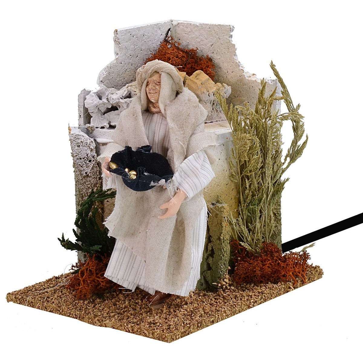 Elemosinante arabo 12 cm in movimento, alza e abbassa il braccio con cui tiene un cappello con delle monete. La scena è ben rifinita con muretto ad angolo e vegetazione. La statua presenta un viso di terracotta molto espressivo ed è accuratamente vestita con abiti in tessuto, ogni pezzo è realizzato interamente a mano da artigiani italiani pertanto i colori e gli abiti potrebbero variare. L'articolo è funzionante a corrente.