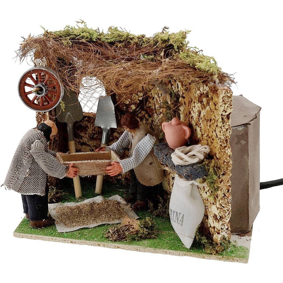Contadini in movimento che setacciano la farina di grano, funzionanti a corrente. Statue in movimento per presepe realizzate in terracotta vestite con tessuto altezza statue 10 cm.