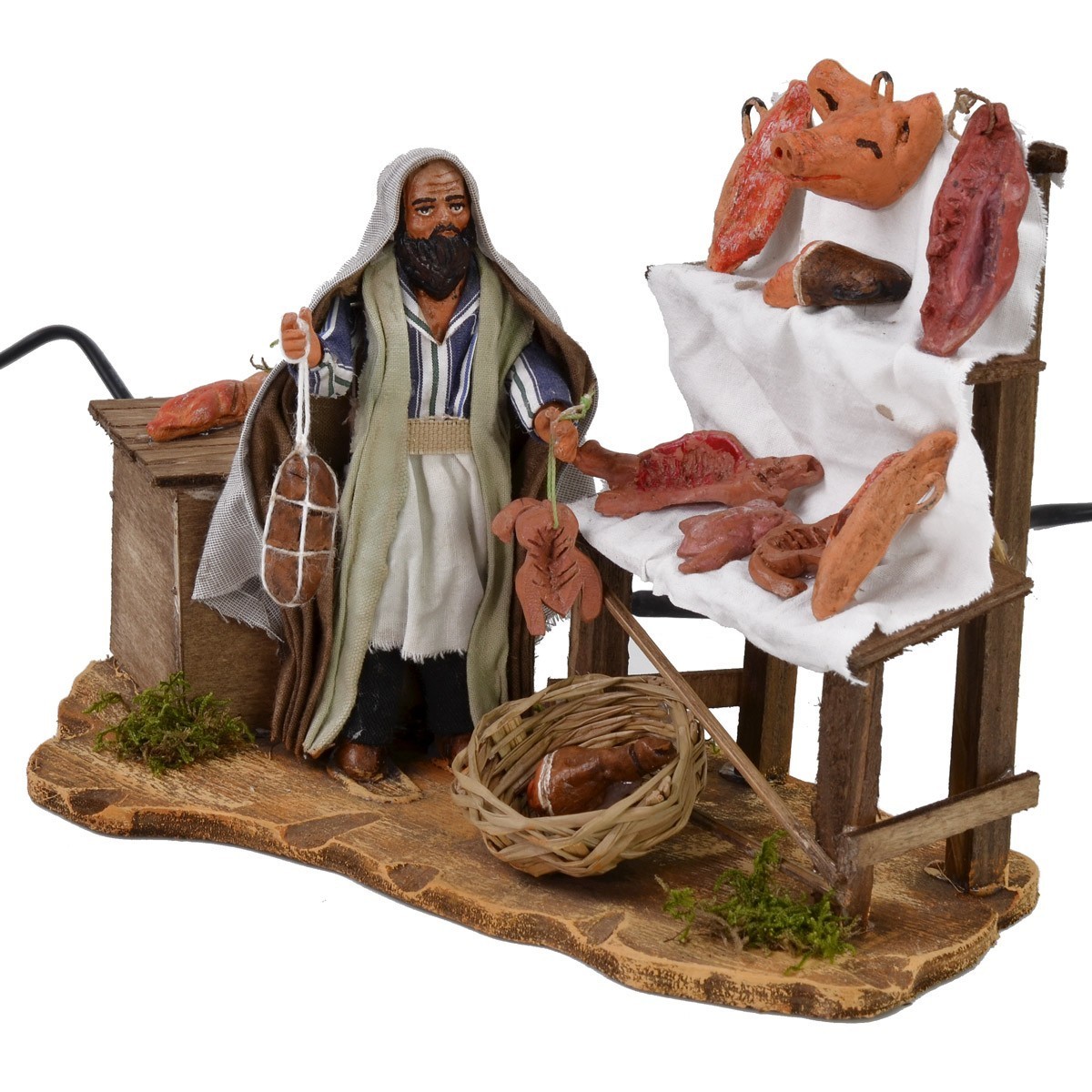 Scenografia per Presepe raffigurante un venditore di salumi, della serie da 12 cm, funzionante a corrente, realizzato in terracotta, dipinto a mano e vestito con abiti in stoffa. Il soggetto alza e abbassa il braccio con cui impugna un salume, invitando i passanti all'acquisto. Completano la scenografia un'imponente banchetto espositivo e cesti colmi di minuterie ben rifinite e dall'aspetto molto realistico, raffiguranti carni e salumi di ogni tipo. Statua per Presepe realizzata in Italia, ben rifinita nei dettagli: il personaggio presenta un viso molto espressivo e la scena è caratterizzata da qualche ciuffetto di verde vegetazione circostante. Ottimo prodotto per rendere unico ed originale il vostro Presepe.