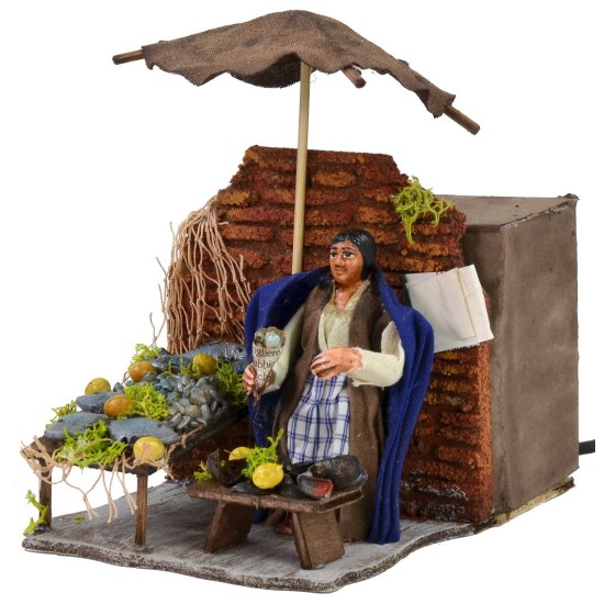 Scenografia per Presepe raffigurante una pescivendola, della serie da 8 cm, funzionante a corrente, realizzata in terracotta dipinta a mano e vestita con abiti in stoffa. Il soggetto alza ed abbassa il braccio con il quale impugna un cono contenente del pesce, dandolo all'acquirente. Completa la scenografia un banchetto espositivo colmo di minuterie ben rifinite e dall'aspetto molto realistico, raffiguranti pesci e molluschi vari. La Statua per Presepe è realizzata in Italia da sapienti mani artigiane e risulta ben rifinita nei dettagli: il personaggio presenta un viso molto espressivo. Ottimo prodotto per rendere unico ed originale il vostro Presepe.