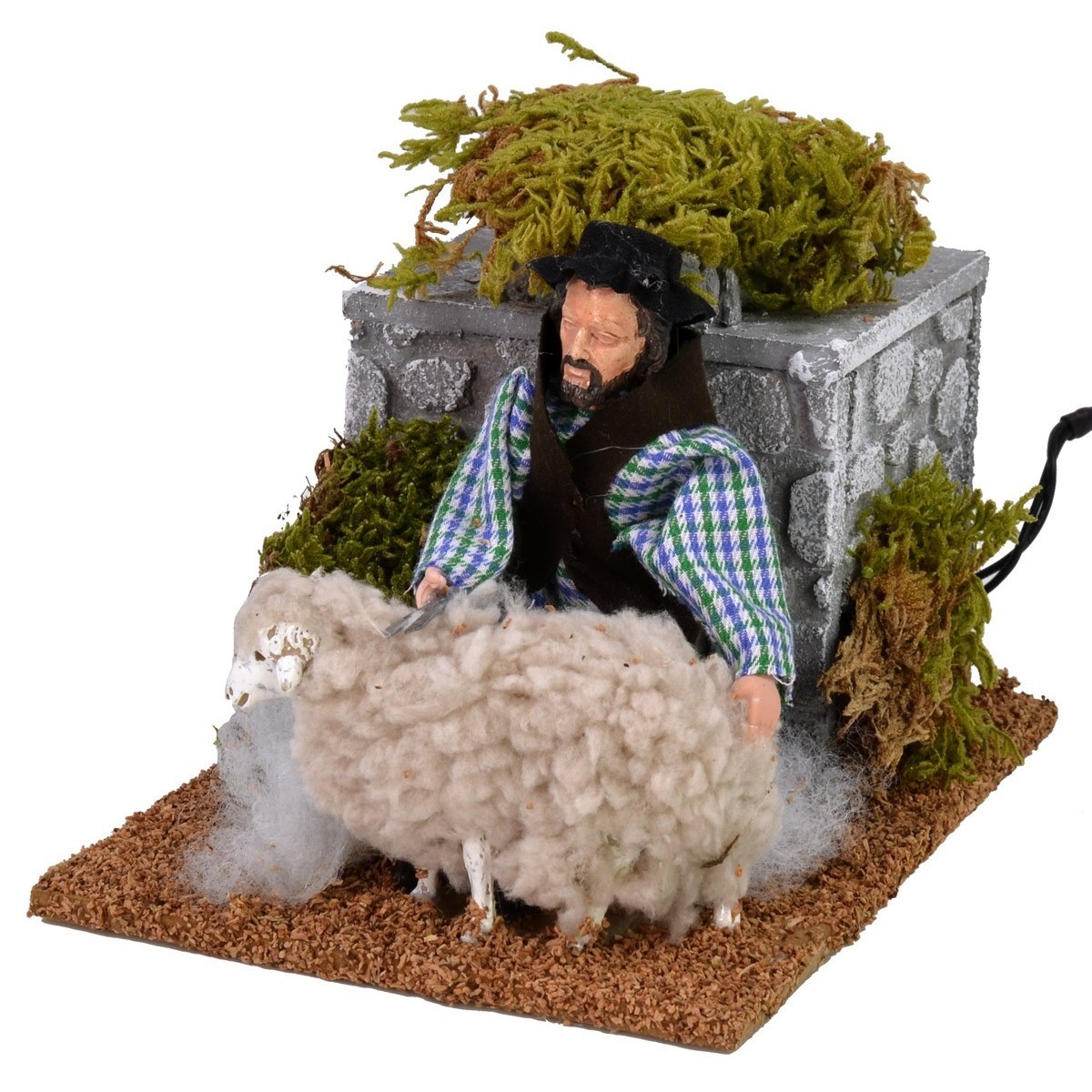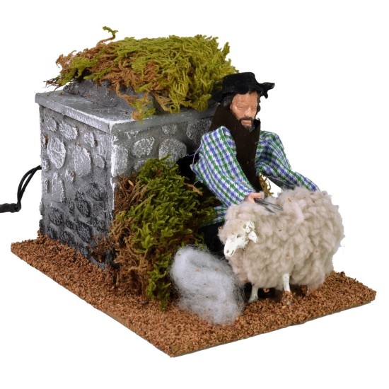 Tosatore seduto che muove il braccio con cui impugna le forbici per tagliare la lana della pecora. Scena per Presepe realizzata artigianalmente in Italia, ben rifinita nei dettagli con la statua vestita con abiti in tessuto ed un volto molto espressivo; il tutto è arricchito da un muretto con del muschio e da un batuffolo di lana già tosata. L'articolo è funzionante a corrente.