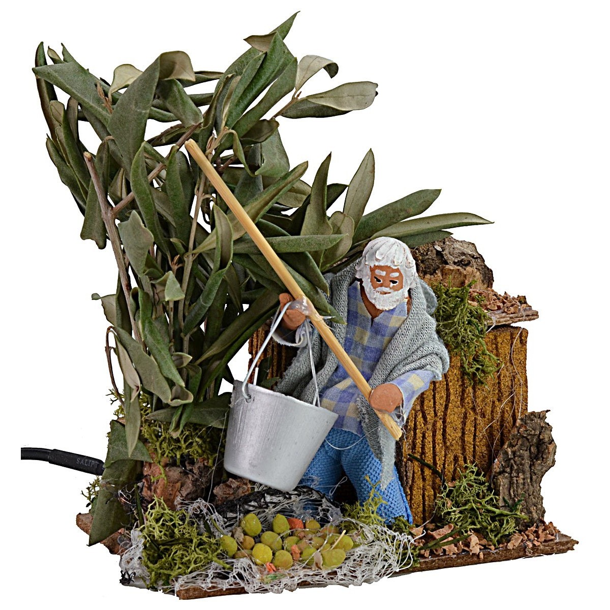 La scenografia per presepe rappresenta un uomo che, girato di tre quarti, tiene fra le mani un bastone e un contenitore per raccogliere le olive. Ai piedi del contadino ci sono dei frutti già raccolti. Alla destra del signore è rappresentato un albero di ulivo. La statua è realizzata in terracotta e dipinta a mano in Italia da mani artigiane con abiti in tessuto ed è dotata di una spina funzionante a corrente. La statua per il Presepe classico e/o napoletano misura 10 cm ed è caratterizzata dall'uso di materiali come il legno, il sughero, la stoffa e la terracotta.