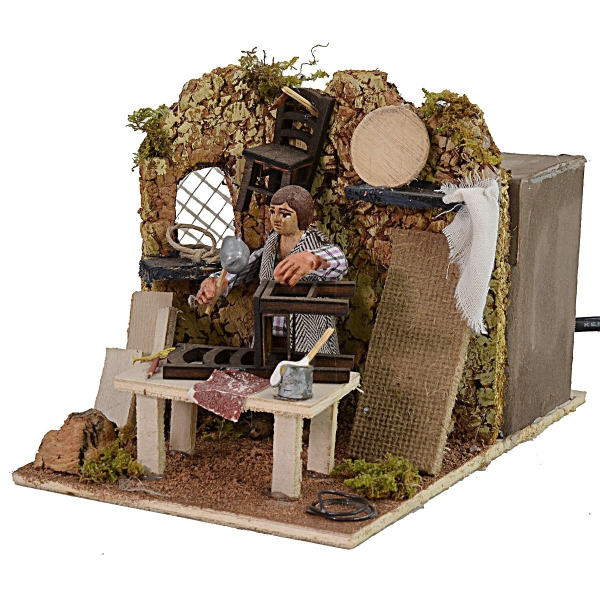 La scenografia per Presepe raffigura un riparatore di sedie della serie da 8 cm. L'uomo tiene fra le mani un martello e sta aggiustando una sedia, circondato dai suoi attrezzi. La statua è realizzata in terracotta e dipinta a mano in Italia da mani artigiane con abiti in tessuto ed è dotata di una spina funzionante a corrente. La statua per il Presepe classico e/o napoletano misura 8 cm ed è caratterizzata dall'uso di materiali come il legno, il sughero, la stoffa e la terracotta.
