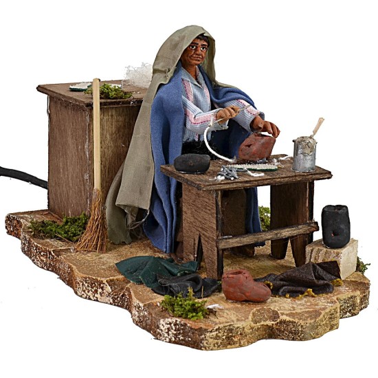 La scenografia rappresenta un ciabattino mentre rammenda delle scarpe della serie da 8 cm funzionante a corrente, realizzato in terracotta dipinta a mano e vestito con abiti in stoffa. La statua per Presepe è realizzata in Italia da sapienti mani artigiane e risulta ben rifinita nei dettagli: il personaggio presenta un viso molto espressivo. Ottimo prodotto per rendere unico ed originale il vostro Presepe.
