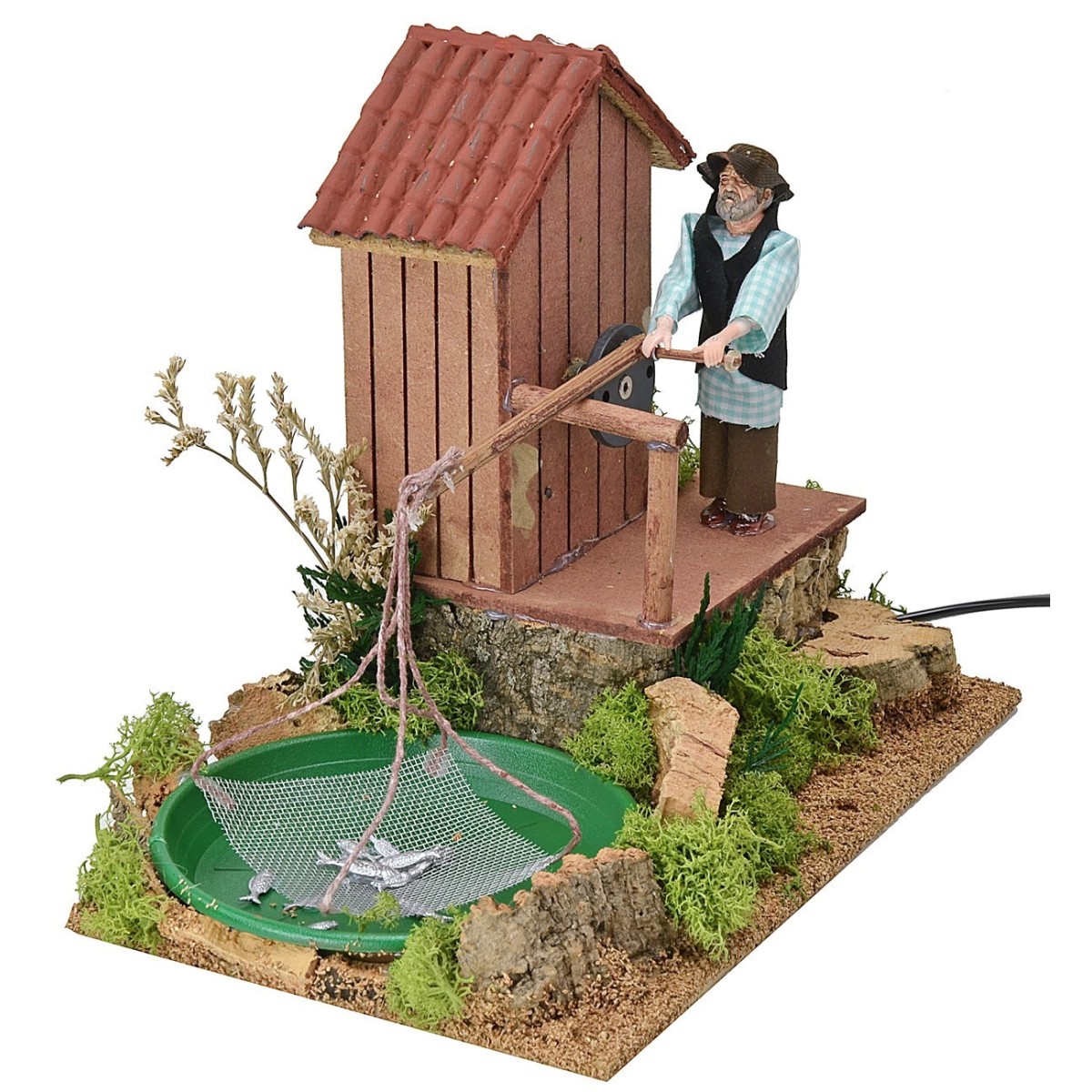 Pescatore in movimento che pesca alzando la bilancia posizionata sul laghetto. Scena per Presepe realizzata artigianalmente in Italia, ben rifinita nei dettagli con la statua vestita da abiti in tessuto ed un volto molto espressivo. L'articolo è funzionante a corrente ed è arricchito da muschio, sughero ed una baracca in legno.