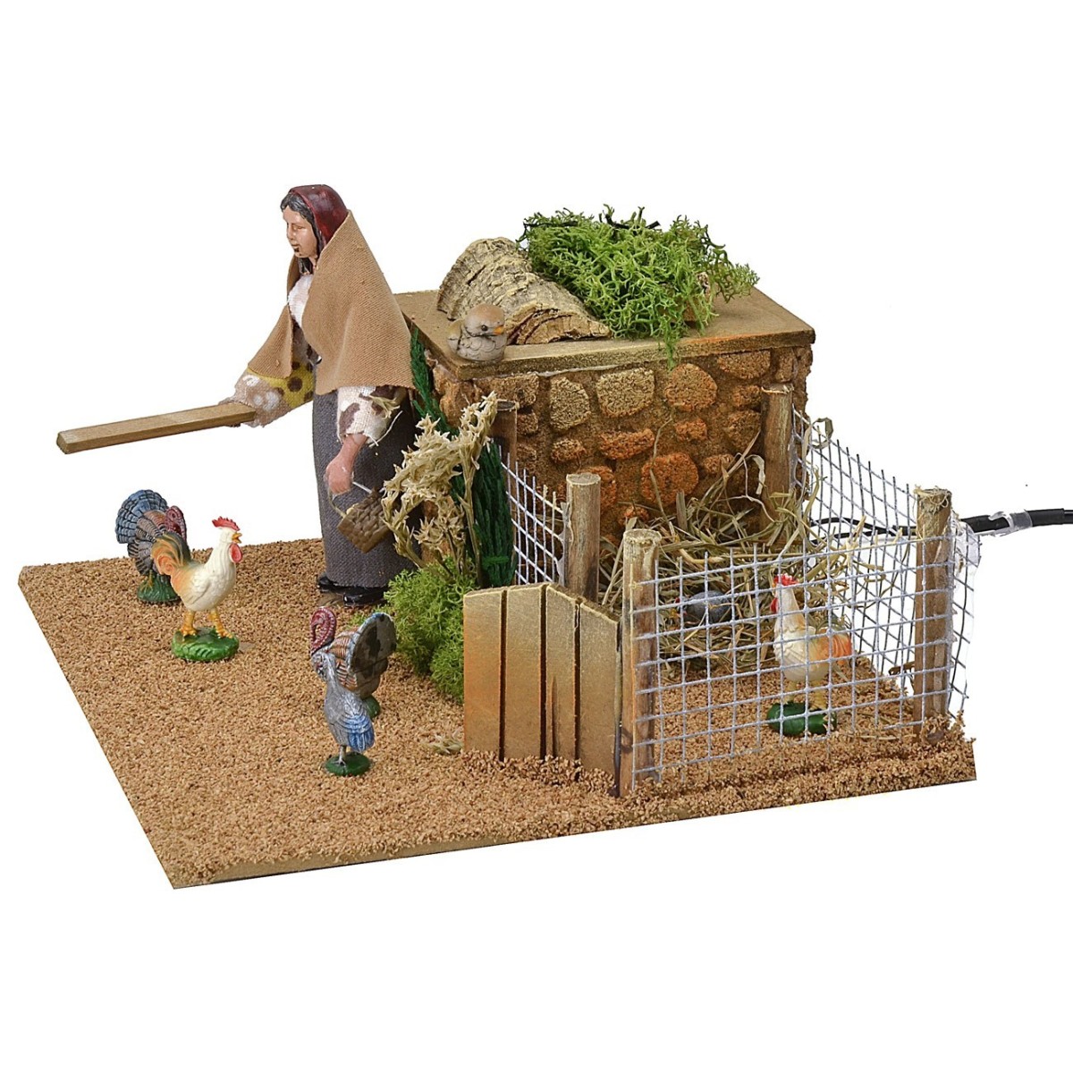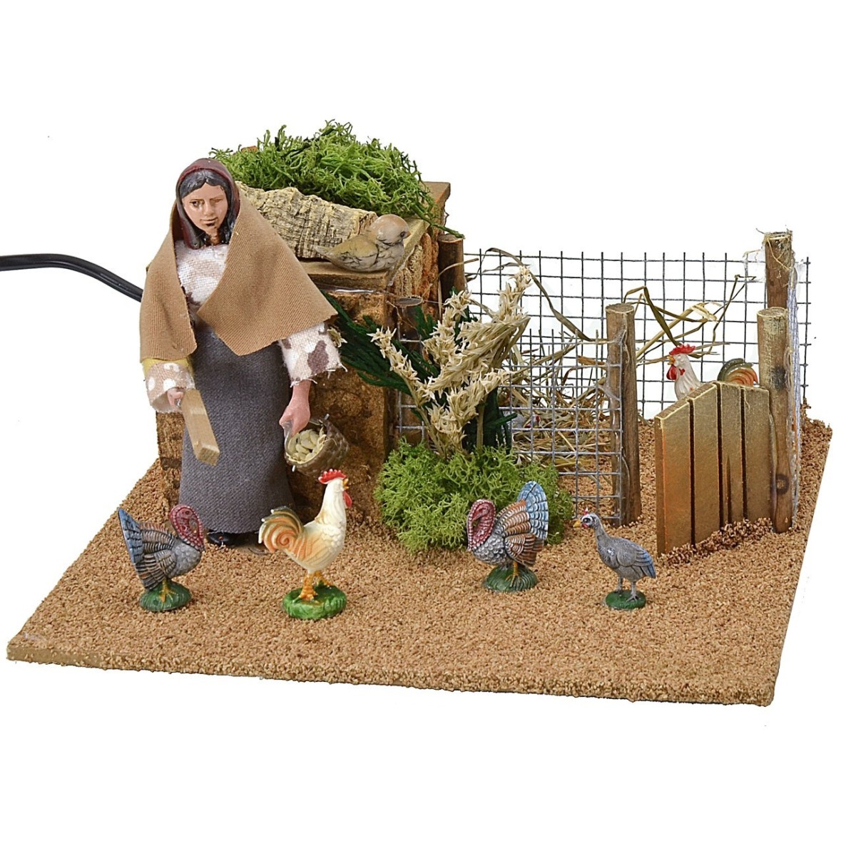 Donna in movimento che alza il braccio con cui afferra il bastone per accompagnare le galline all’interno del pollaio. Scena per Presepe realizzata artigianalmente in Italia, ben rifinita nei dettagli con la statua vestita con abiti in tessuto ed il tutto è arricchito da un recinto e dalla vegetazione. L’articolo è funzionante a corrente.